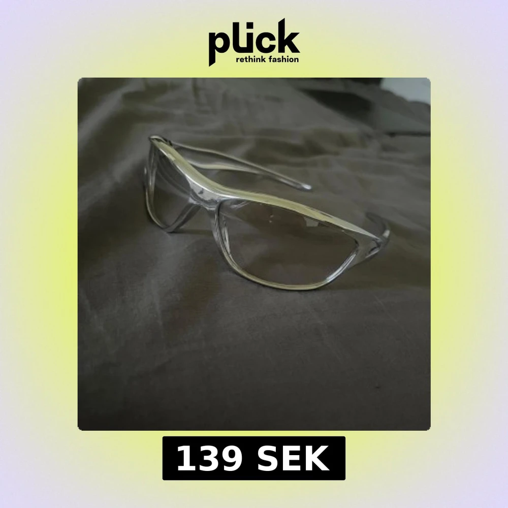 Säljer ett par silvriga sportglasögon med futuristisk design och breda bågar. Glasögonen har en snygg, svepande form och genomskinliga linser. Y2k glasögon. helt ny.
