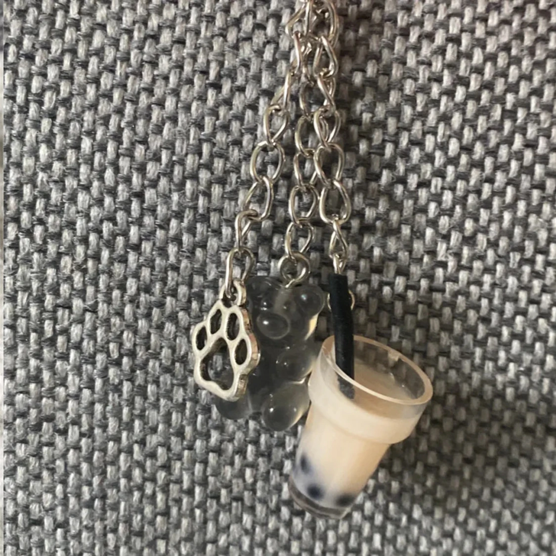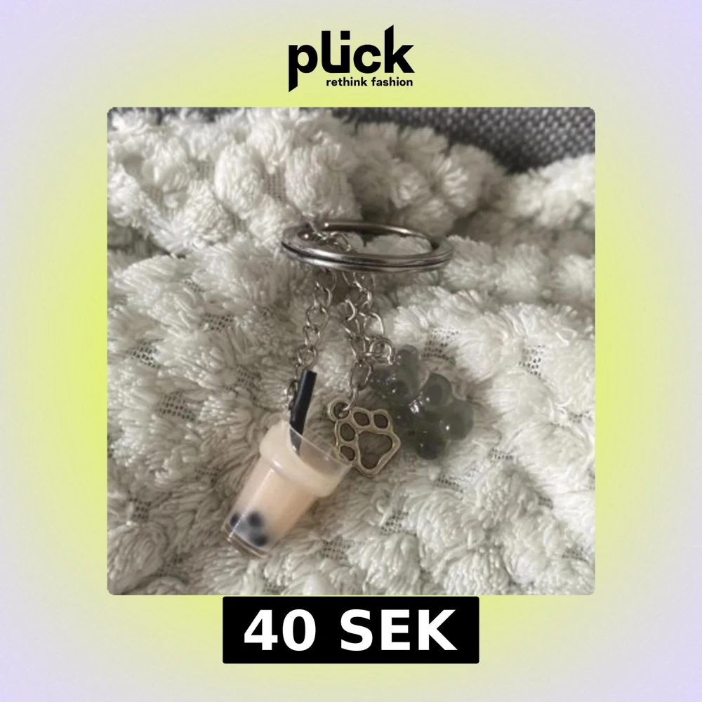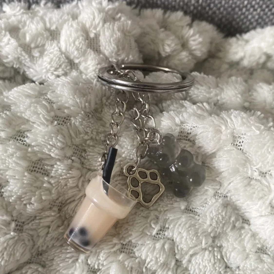 En mycket fin och gullig nyckelring som aldrig är använd. Är en gummibjörn, en tass och en boba Tea berlock