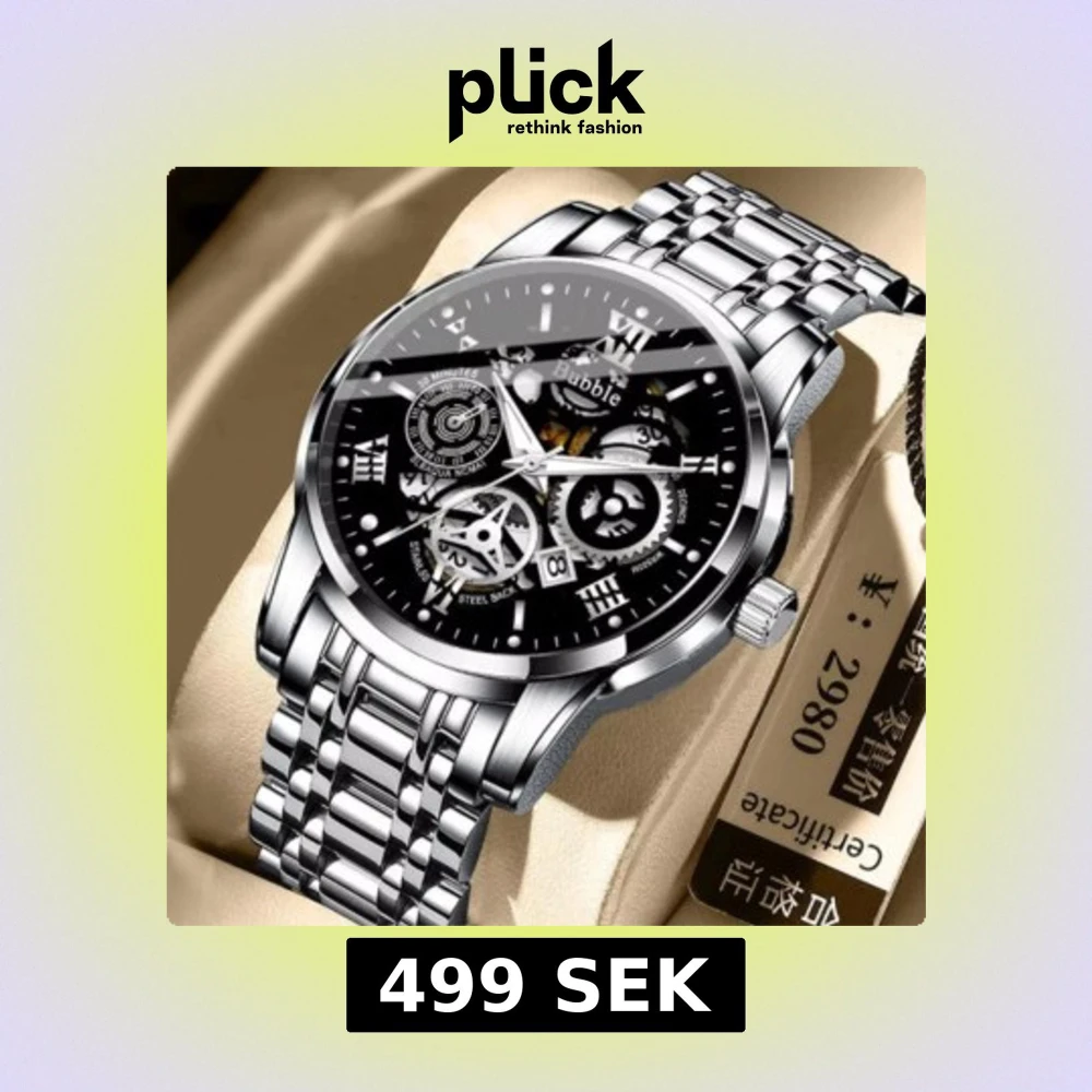Elegant silverfärgad klocka med synlig urtavla och romerska siffror. Klockan har ett detaljerat mekaniskt urverk och en robust länkarmband. Perfekt för den som gillar en klassisk och stilren design.