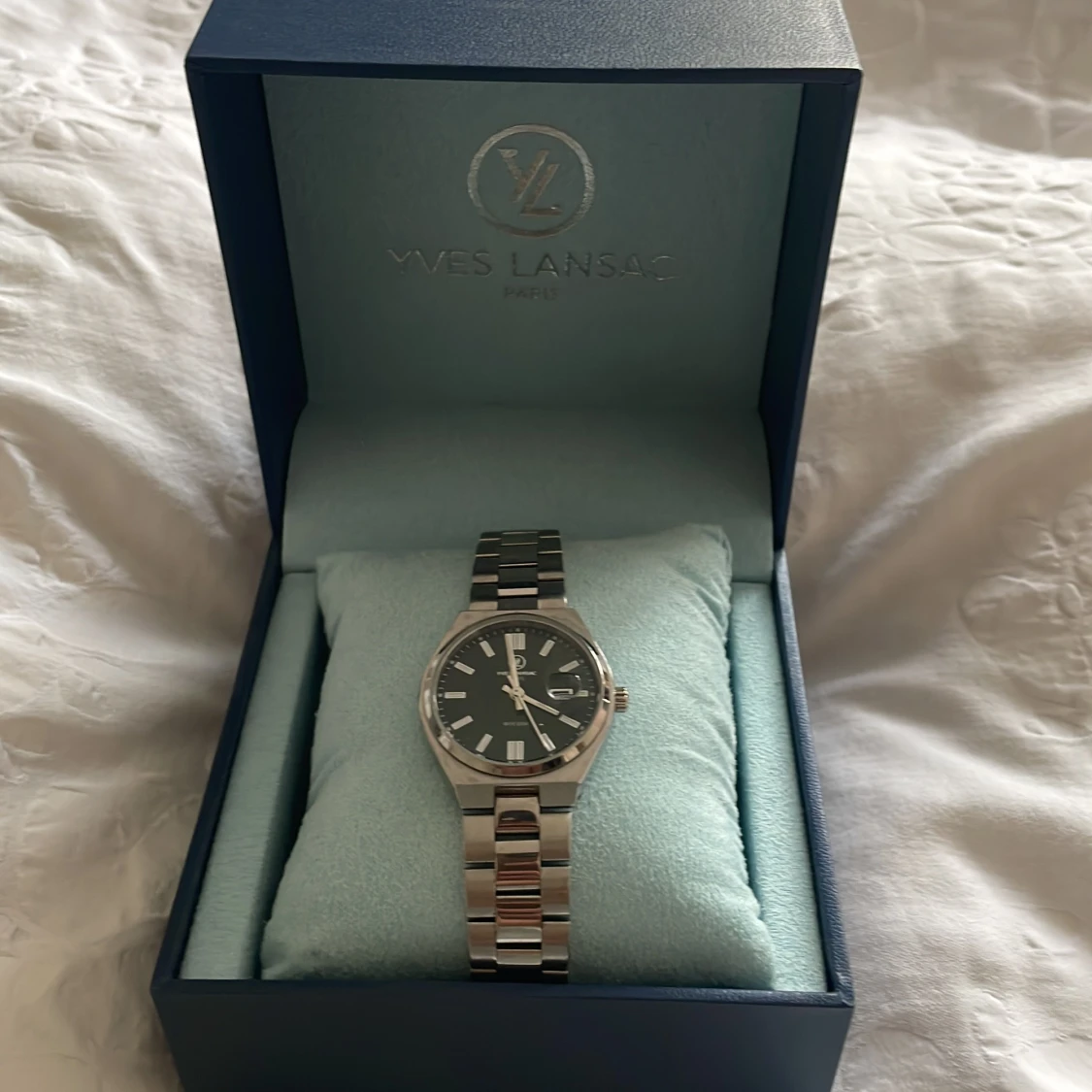 Stilren klocka från Yves Lansac Paris med svart urtavla och silverfärgad länk i metall. Klockan levereras i originalask och extra länkbitar medföljer. Klassisk design med tydliga index och datumfönster, perfekt för dig som gillar en clean look.