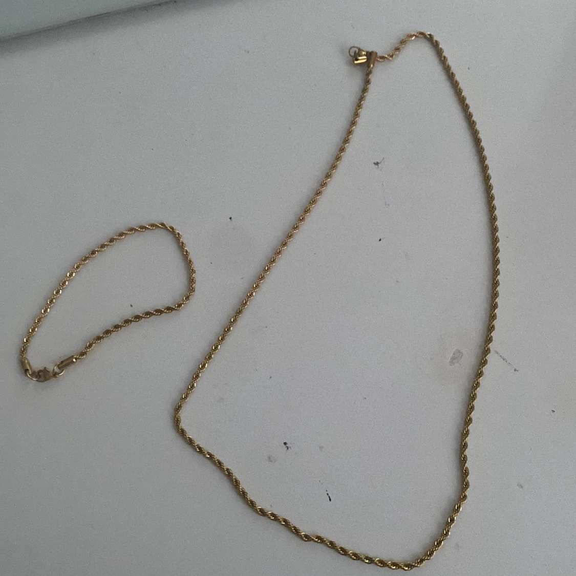 Elegant set med ett guldhalsband och matchande armband. Halsbandet har en fin vriden design. Perfekt för att ge en touch av lyx till din outfit.
