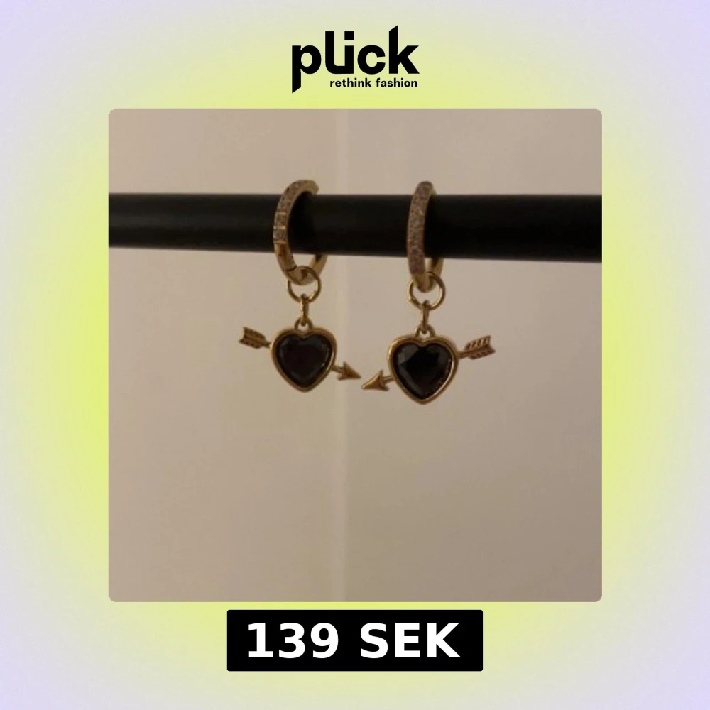 Snygga örhängen i guld med glittriga stenar på ringen och hängande svarta hjärtan som genomborras av en pil. Perfekt för dig som gillar detaljer och vill sticka ut med ett romantiskt smycke.