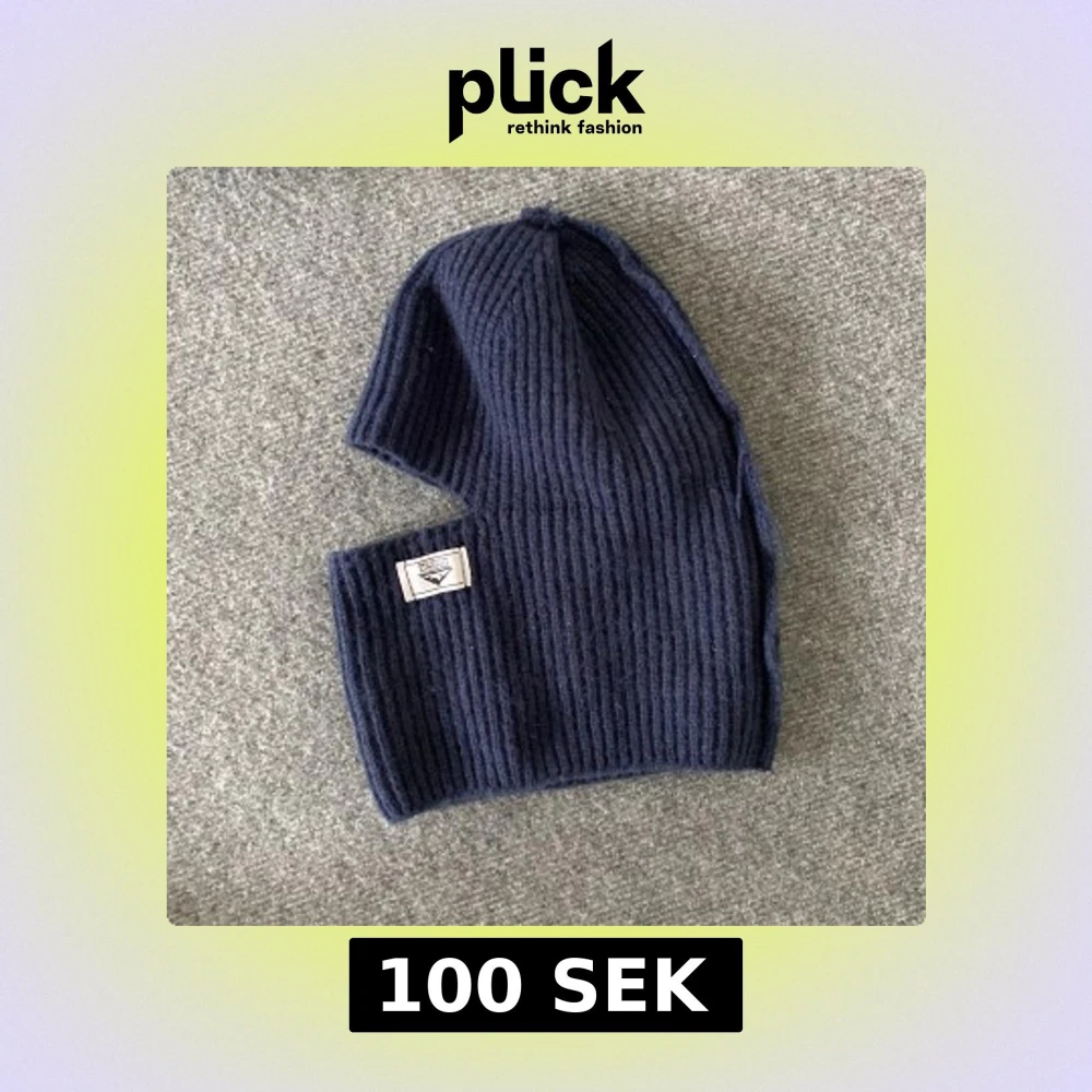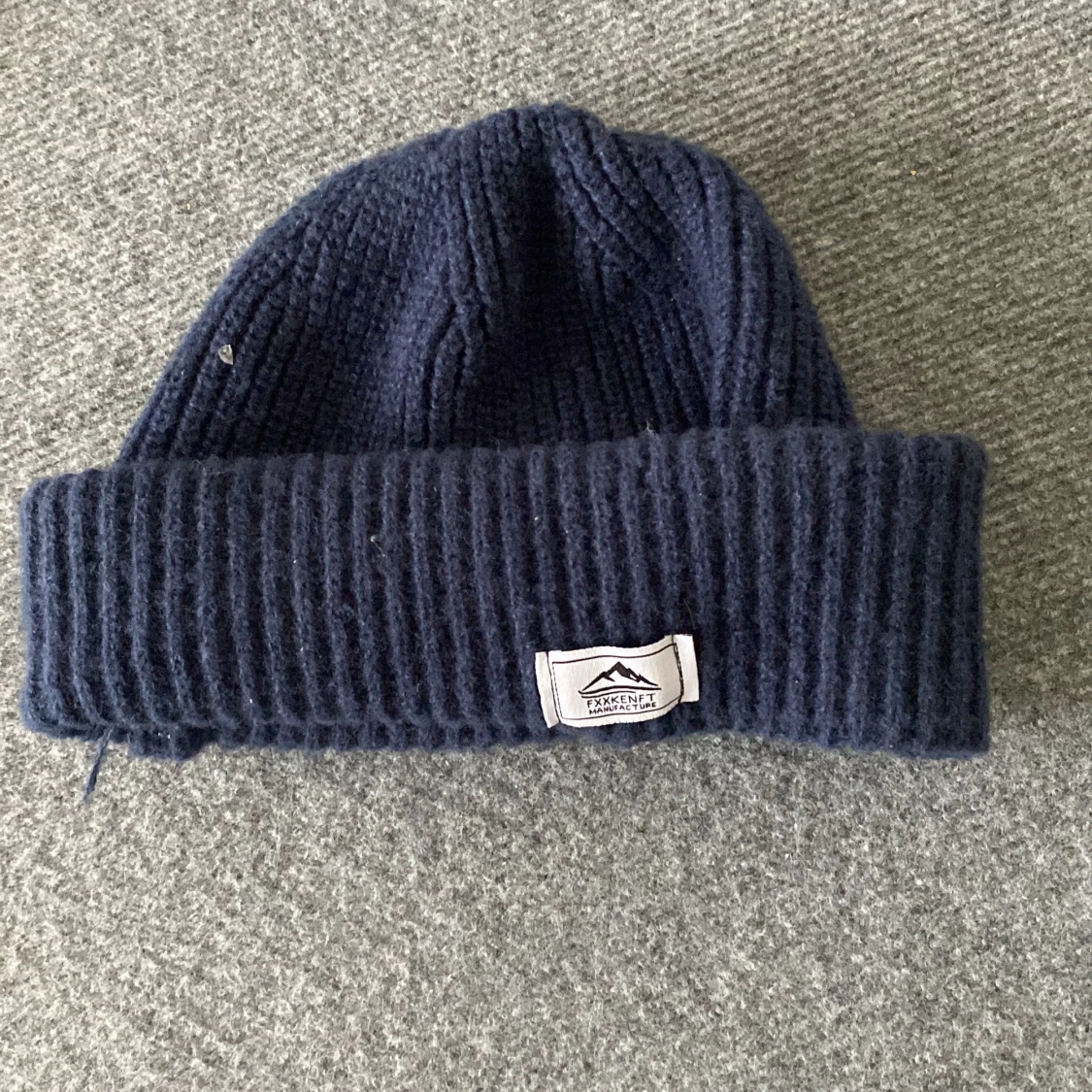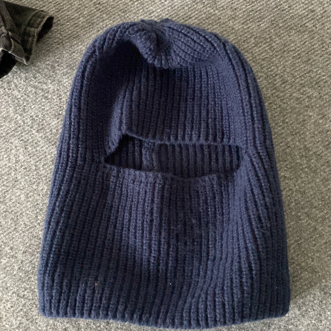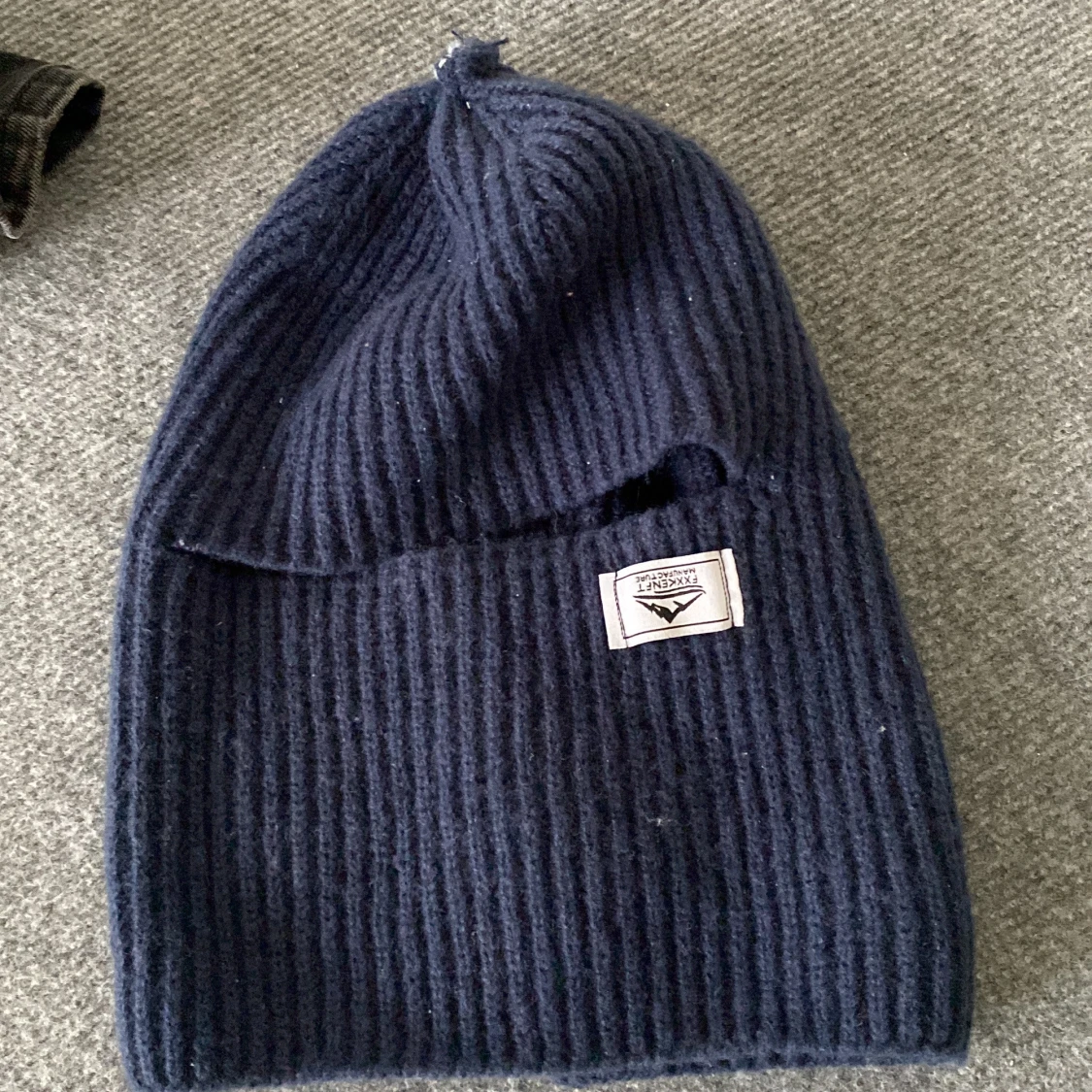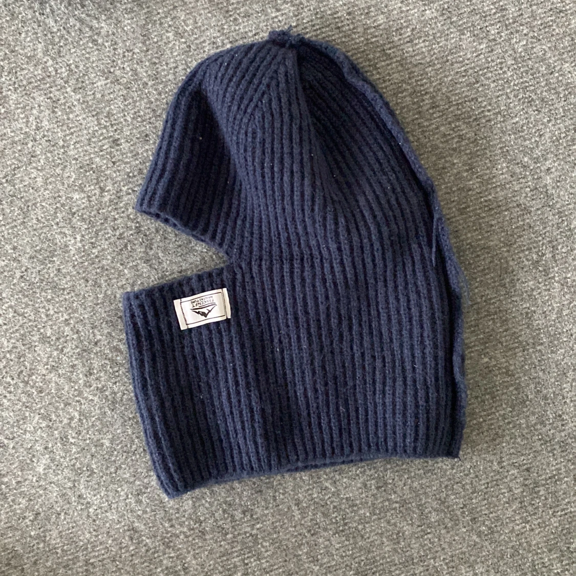 Säljer en mörkblå ribbstickad balaclava från Fakkenet Manufacture. Den är gjord i mjukt, stickat material och har en vit logotyp-patch framtill. Kan bäras både som balaclava och mössa, perfekt för kalla dagar när du vill hålla dig varm och se cool ut.