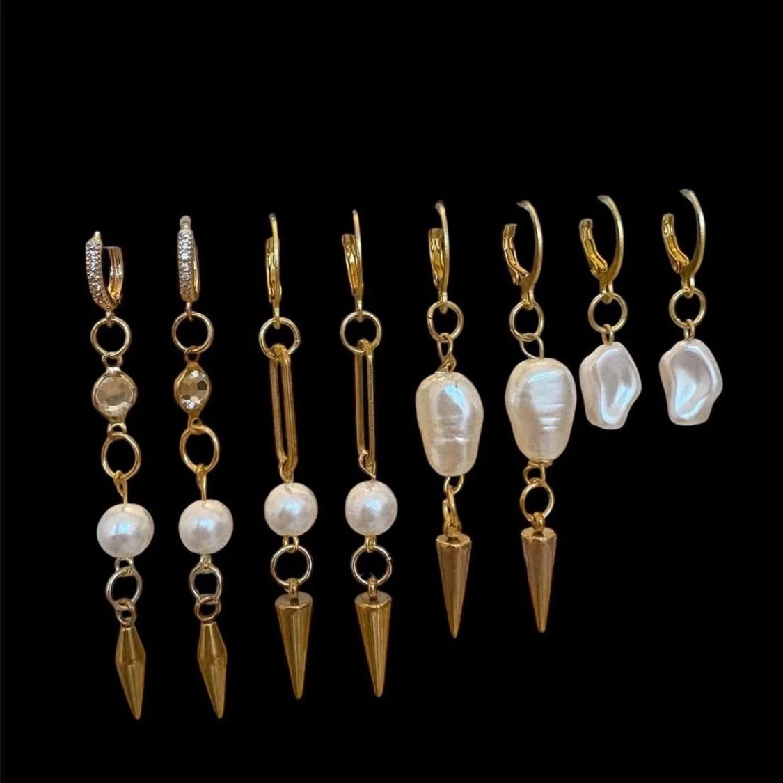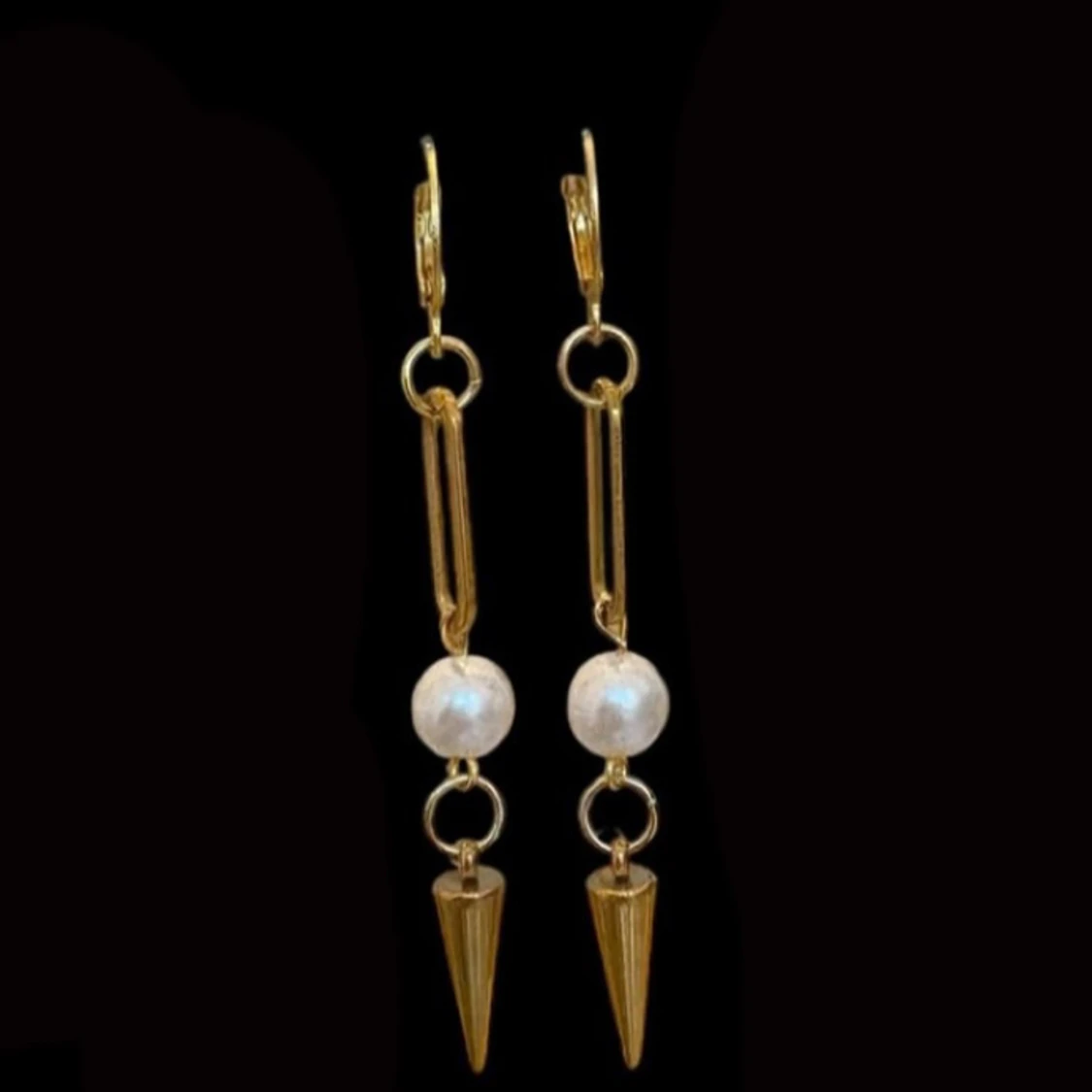 Snygga örhängen i guldton med hängande vita pärlor. Kedjeliknande länk ger en cool och modern känsla. Perfekta för dig som vill sticka ut med unika accessoarer.OBS, Endast öronhångena på första bilden i andra bilden visar det i perspektiv till våra andra smycken💕