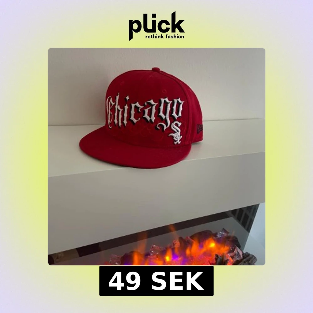Snygg röd keps med broderad text 'Chicago' i vitt och svart. Märke på sidan och MLB-logga bak. Perfekt för att ge din outfit en cool touch.
