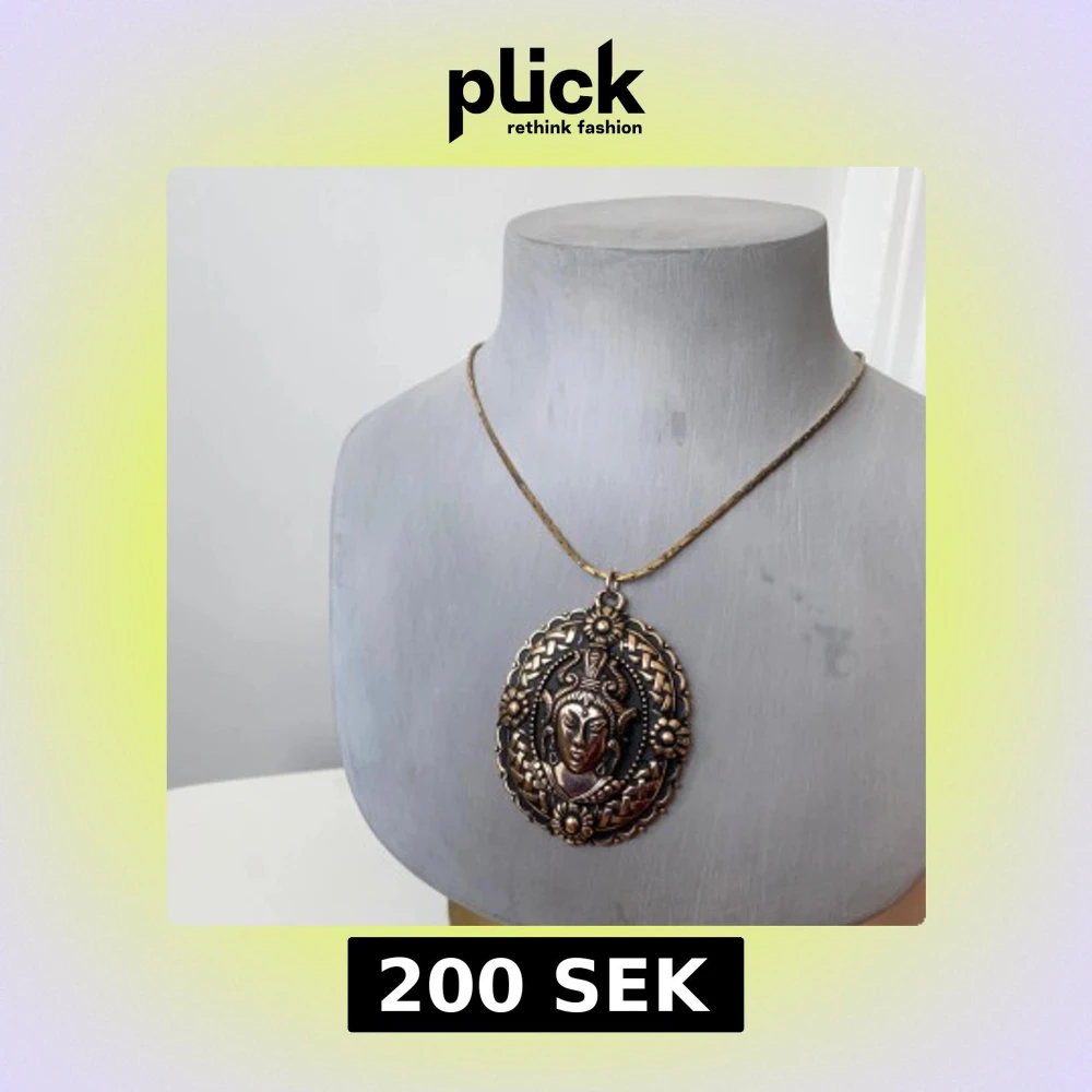 Unikt halsband i antik stil med ett stort, detaljerat hänge föreställande ett ansikte omgivet av blommönster. Kedjan är tunn och elegant i guldton. Perfekt för att ge en bohemisk touch till din outfit.