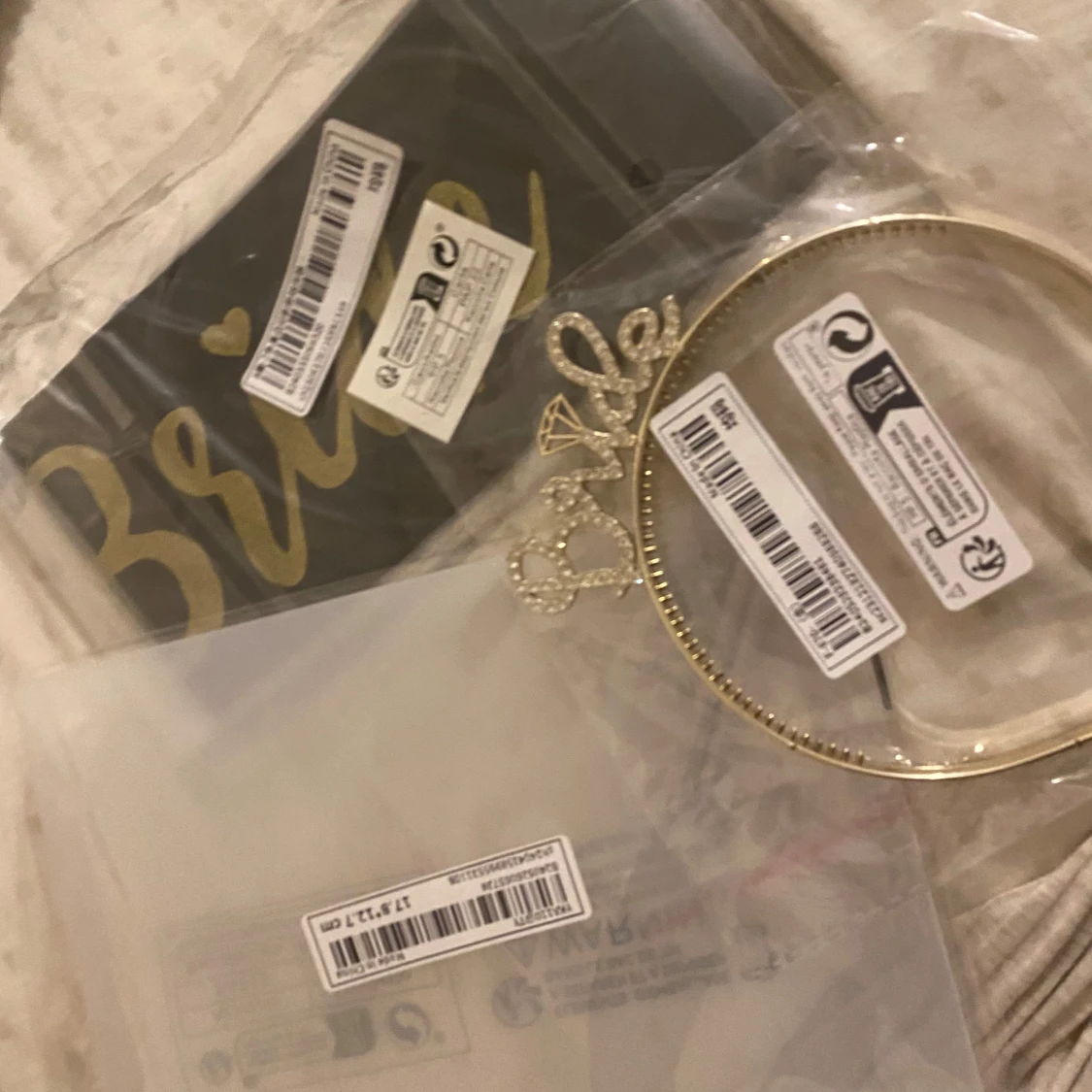 Elegant diadem i guld med glittrande detaljer och texten 'Bride' i strass. Perfekt accessoar för bruden på bröllopsdagen eller möhippan. Den är helt oanvänd, och det finns team bride band som också är till salu