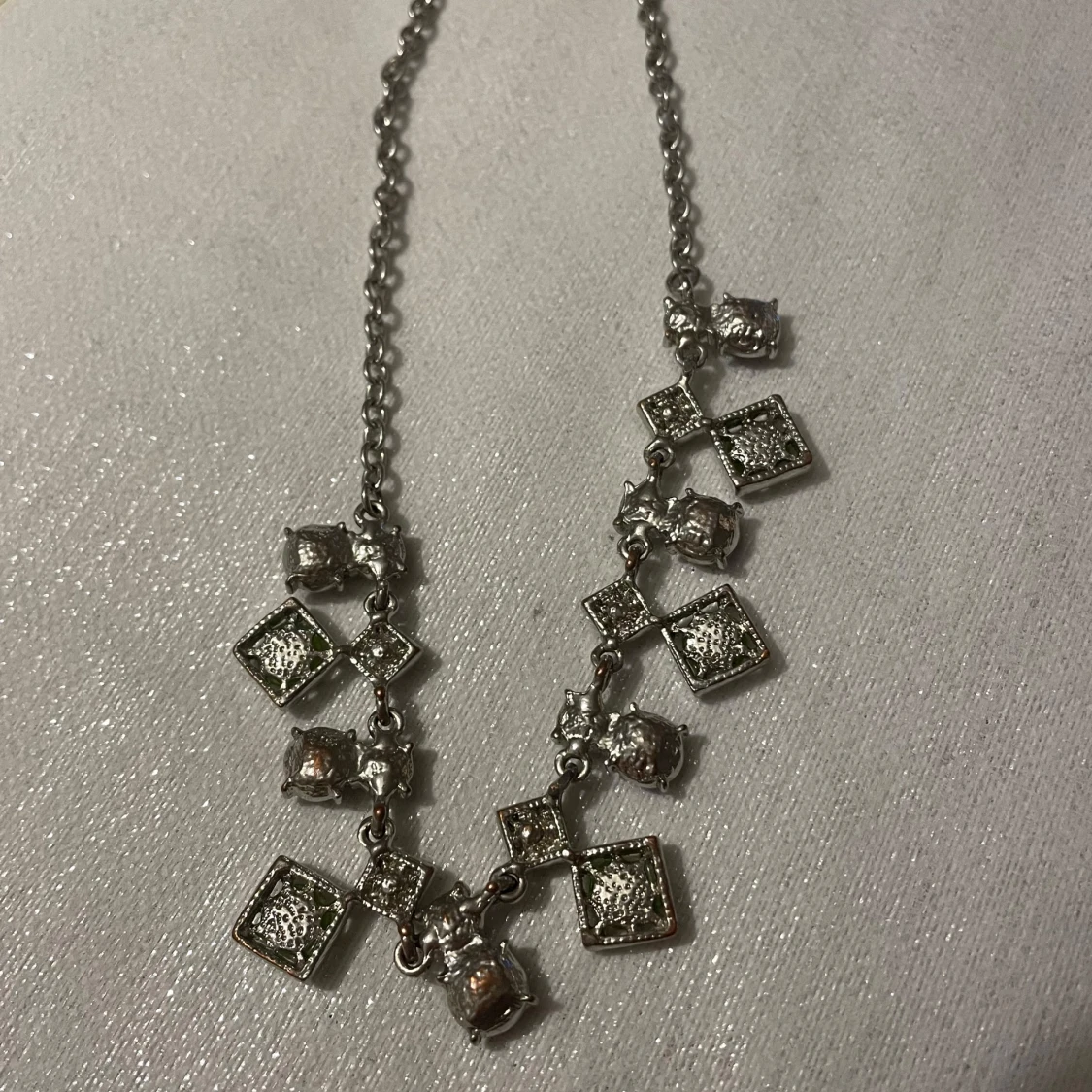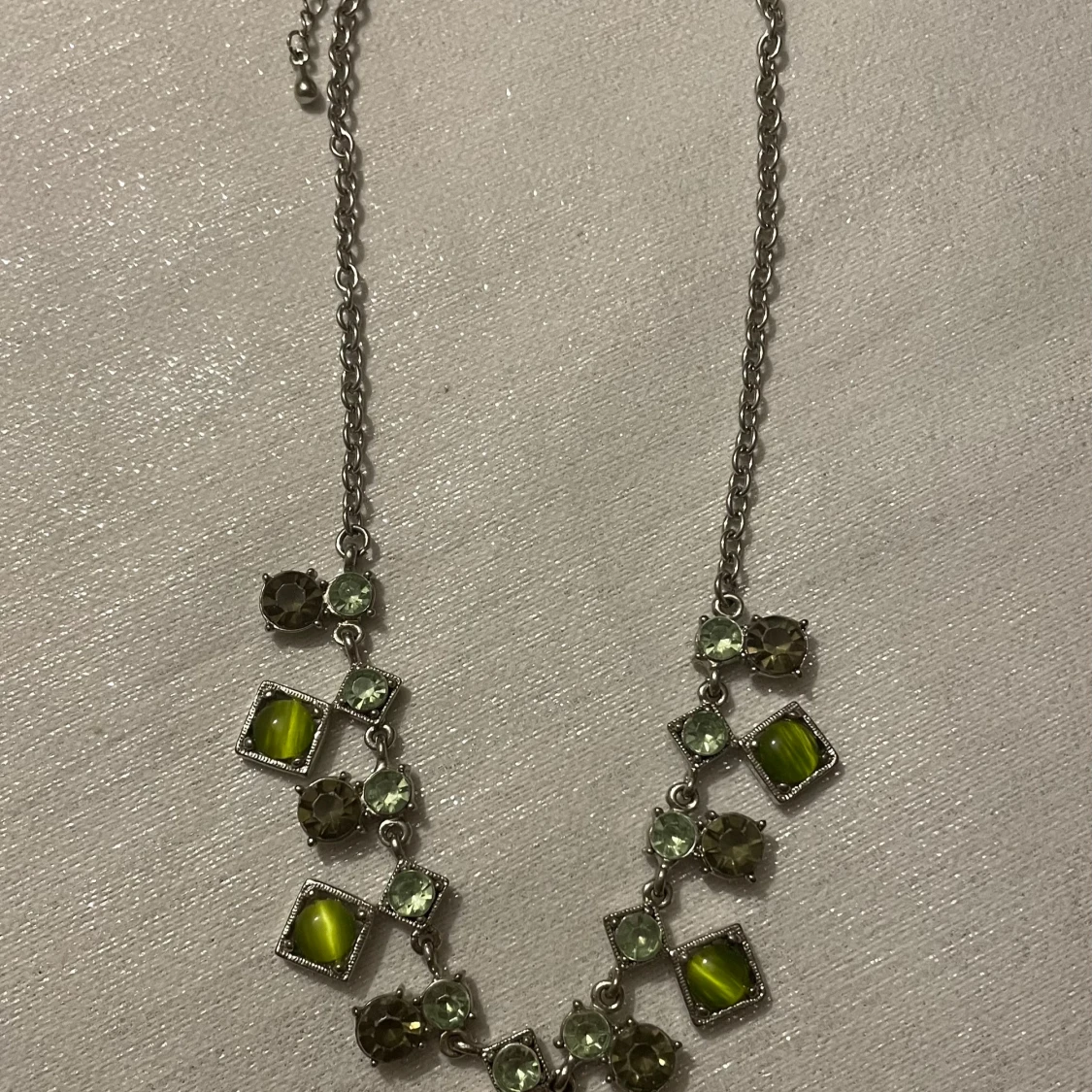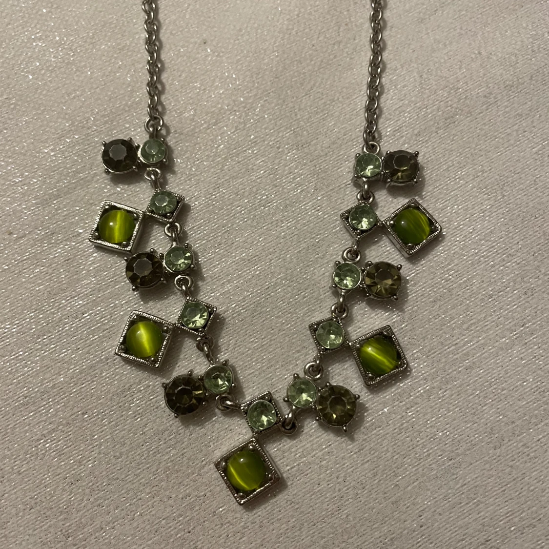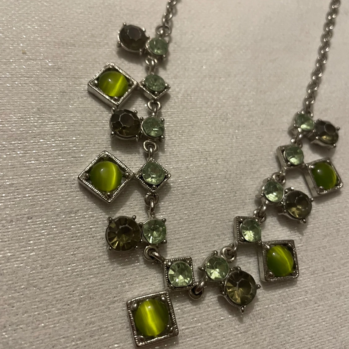 Unikt halsband med en kedja i silverfärg och dekorativa gröna stenar i olika former.