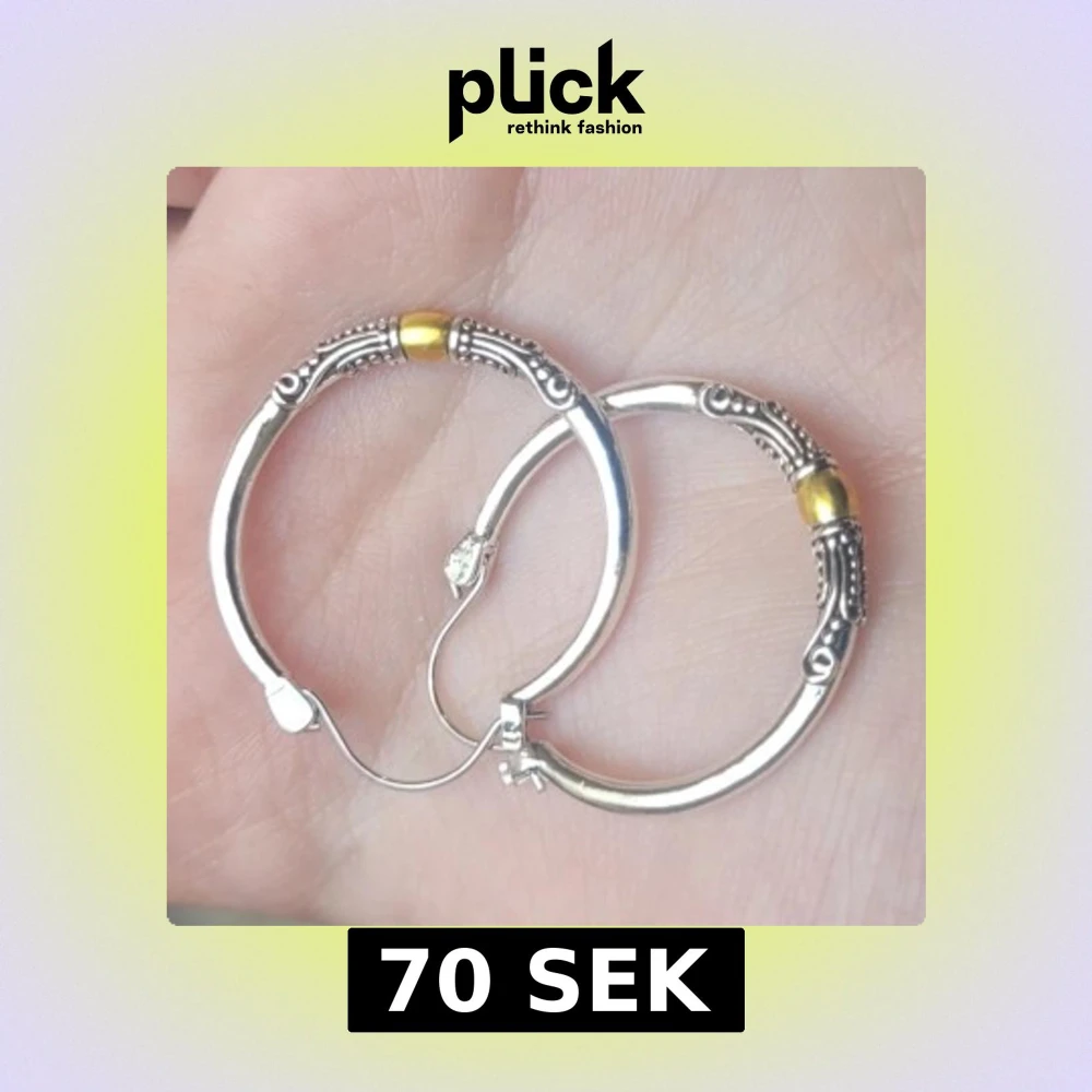 Helt nya Runda silvriga örhängen med snygga detaljer och en gul metallpärla på varje. De har ett klassiskt klicklås och dekorerade mönster längs kanterna som ger en cool vintagekänsla. Perfekt för dig som gillar att sticka ut med accessoarer. 3 cm