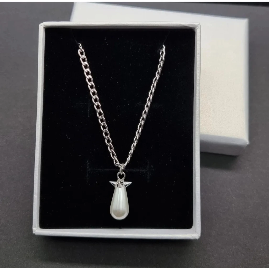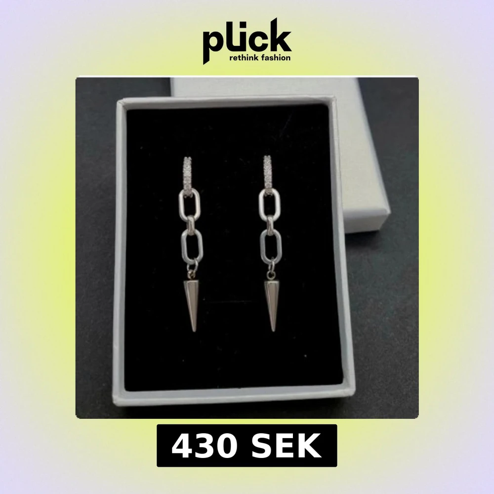 Säljer ett set med coola silverfärgade örhängen med kedjelänkar och spetsiga hängen samt ett matchande halsband med en kedja och en hängande vit pärldroppe formad som en ängel. Perfekt för dig som gillar stilrena och trendiga accessoarer.