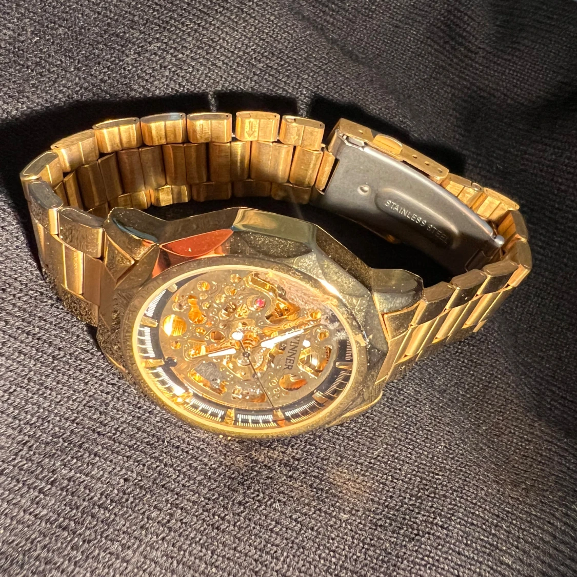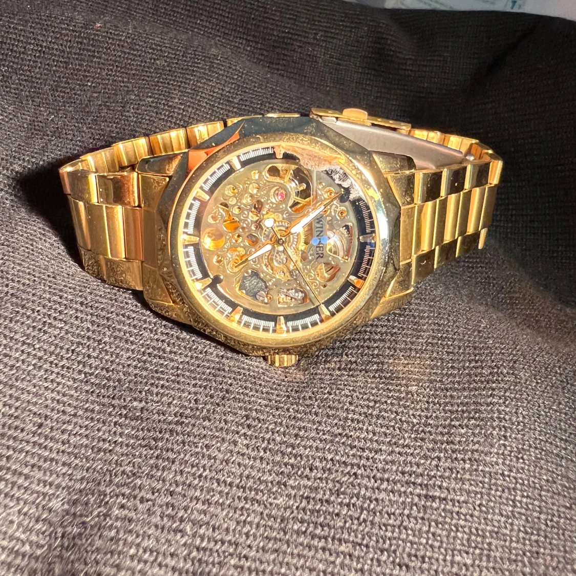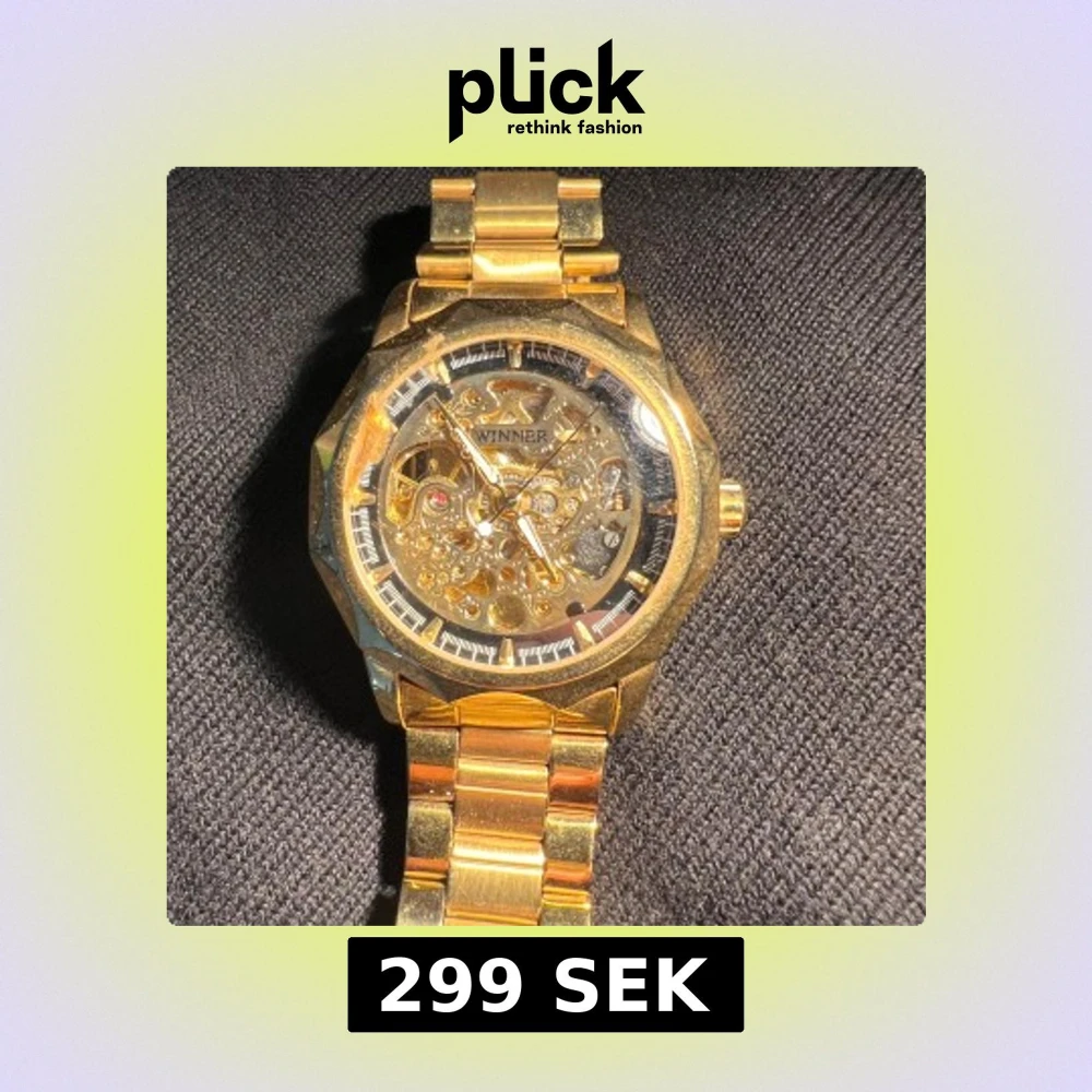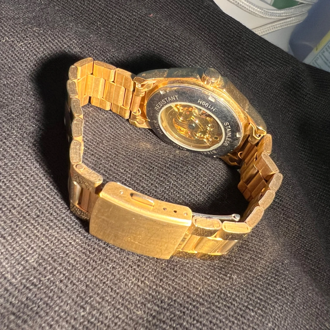 Jätte fin Guldig klocka köpt från Sverige. Det är aoutomatisk så den behöver inga batterier