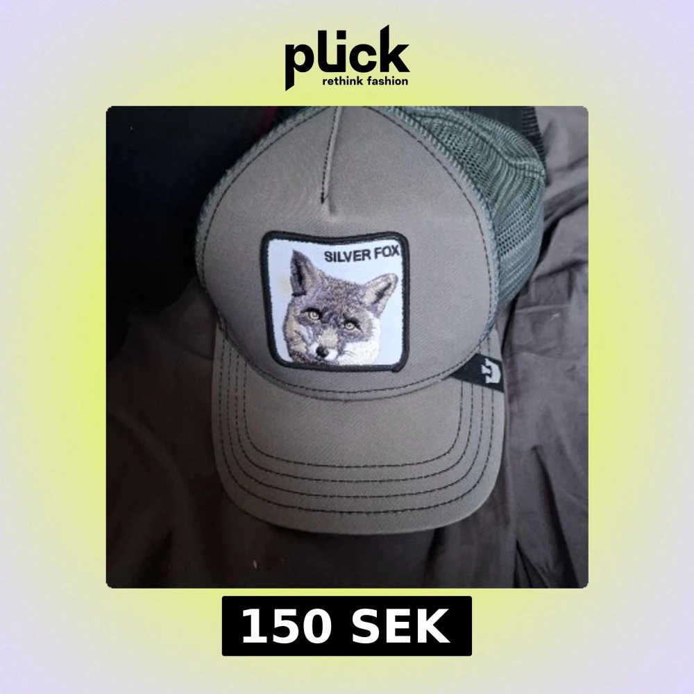 Snygg grå keps från Goorin Bros med broderad patch framtill som föreställer en räv och texten 'SILVER FOX'. Kepsen har nät baktill och böjd skärm för en klassisk look.