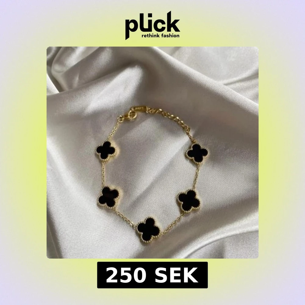 Snyggt armband i guld med sex svarta fyrklöverformade hängen. Kedjan är tunn och elegant, perfekt för att ge en lyxig touch till din stil. Lås med justerbar längd för bästa passform. Den har använts ett fåtal gånger men är som ny