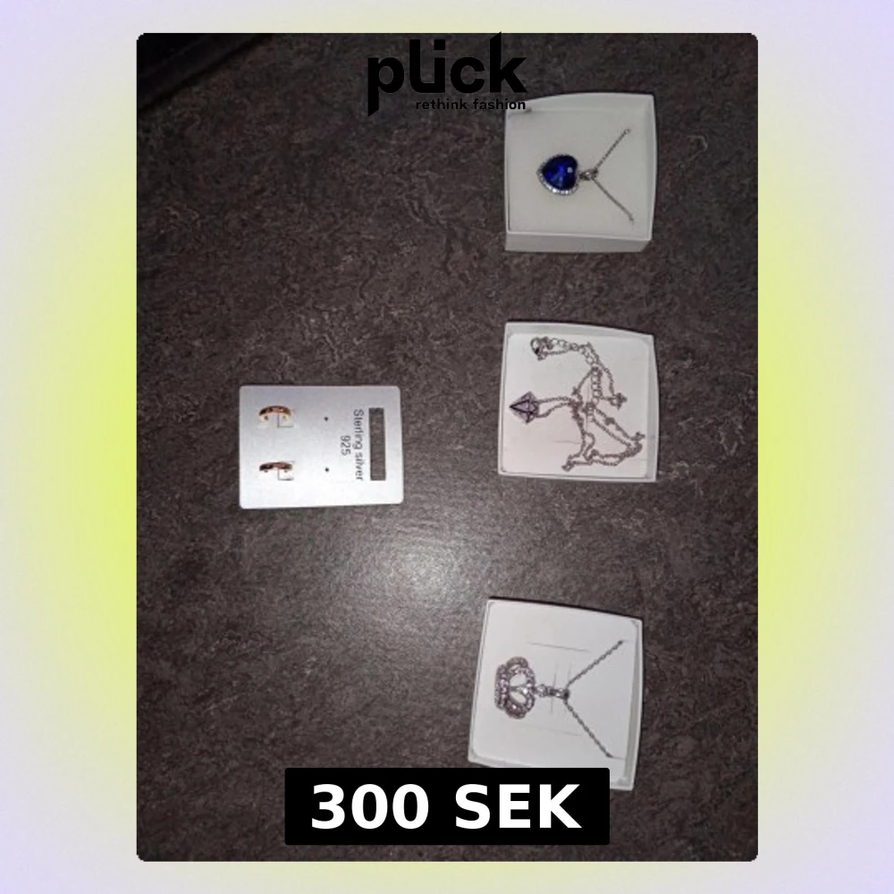 Jag säljer dessa nya smycken tillsammans billigt till paketpris. Örhängena är äkta silver med 18 karats guld plätering. Och halsbanden är vitgulds pläterade. Dessa fyra kostade ca 1000 kr tillsammans.