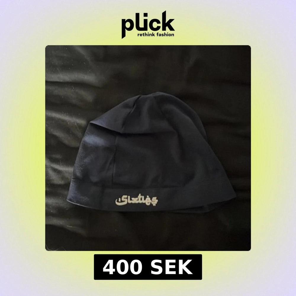 Snygg svart mössa med broderad text framtill. Perfekt för att hålla värmen under kyliga dagar. Enkel och stilren design som passar till det mesta. Helt oskadad och bevarad på ett sparsamt sätt