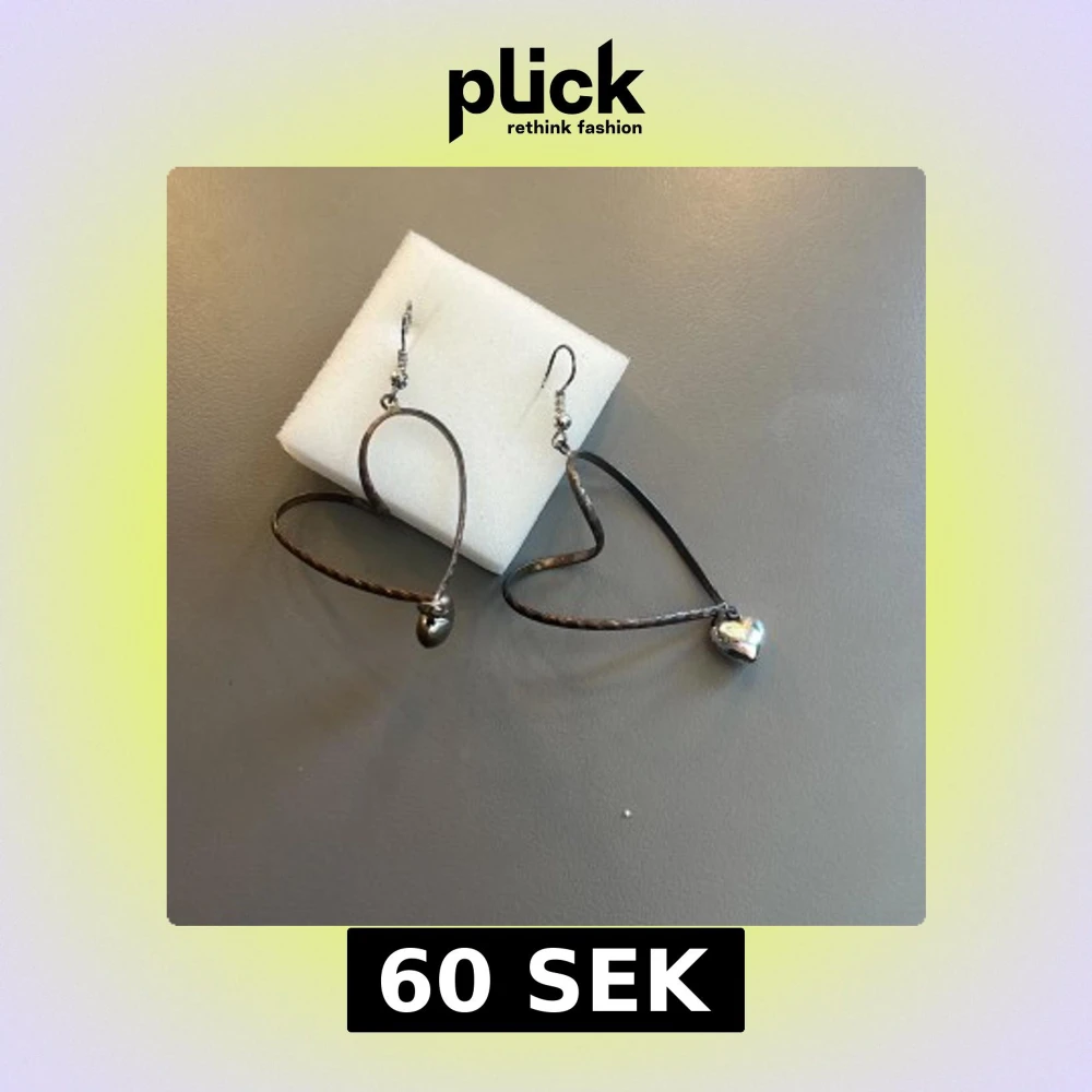 Unika örhängen i form av stora hjärtan i silverfärgad metall med ett litet hängande hjärta längst ner.