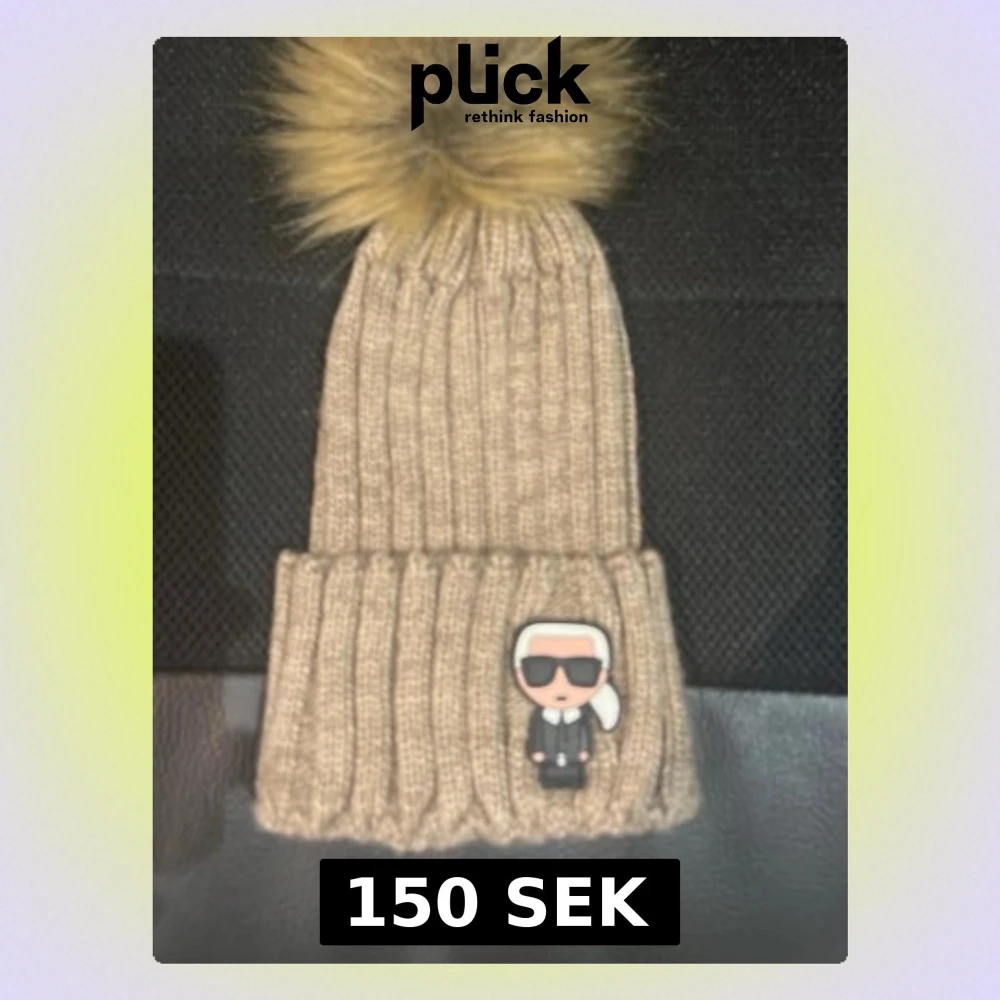 Snygg beige stickad mössa med stor pälsboll på toppen. Mössan har ribbad struktur och en cool patch framtill med en tecknad figur. Perfekt accessoar för att hålla värmen och se trendig ut under kalla dagar.