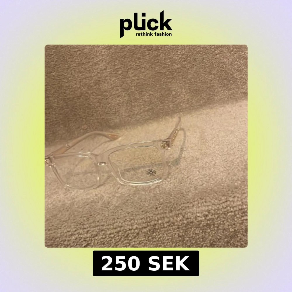 Säljer ett par stilrena glasögon med transparent fyrkantig båge och snygga gulddetaljer på skalmarna. Glasögonen har en modern vibe och passar dig som gillar att sticka ut med accessoarer. Materialet är syntet och designen är riktigt clean.