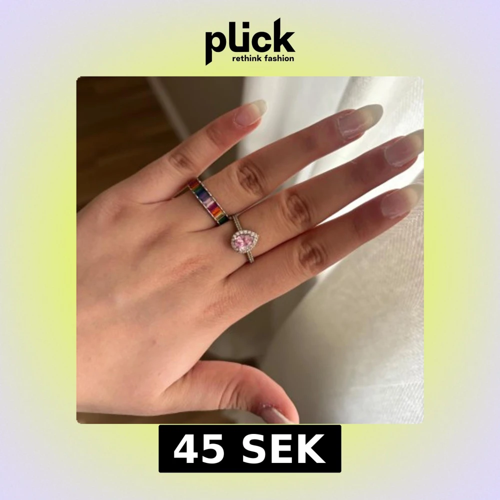 Säljer två snygga ringar! En bred silverfärgad ring med rektangulära stenar i regnbågens alla färger, och en tunnare silverring med en droppformad rosa sten omgiven av små klara stenar. Perfekt för dig som gillar färg och bling!