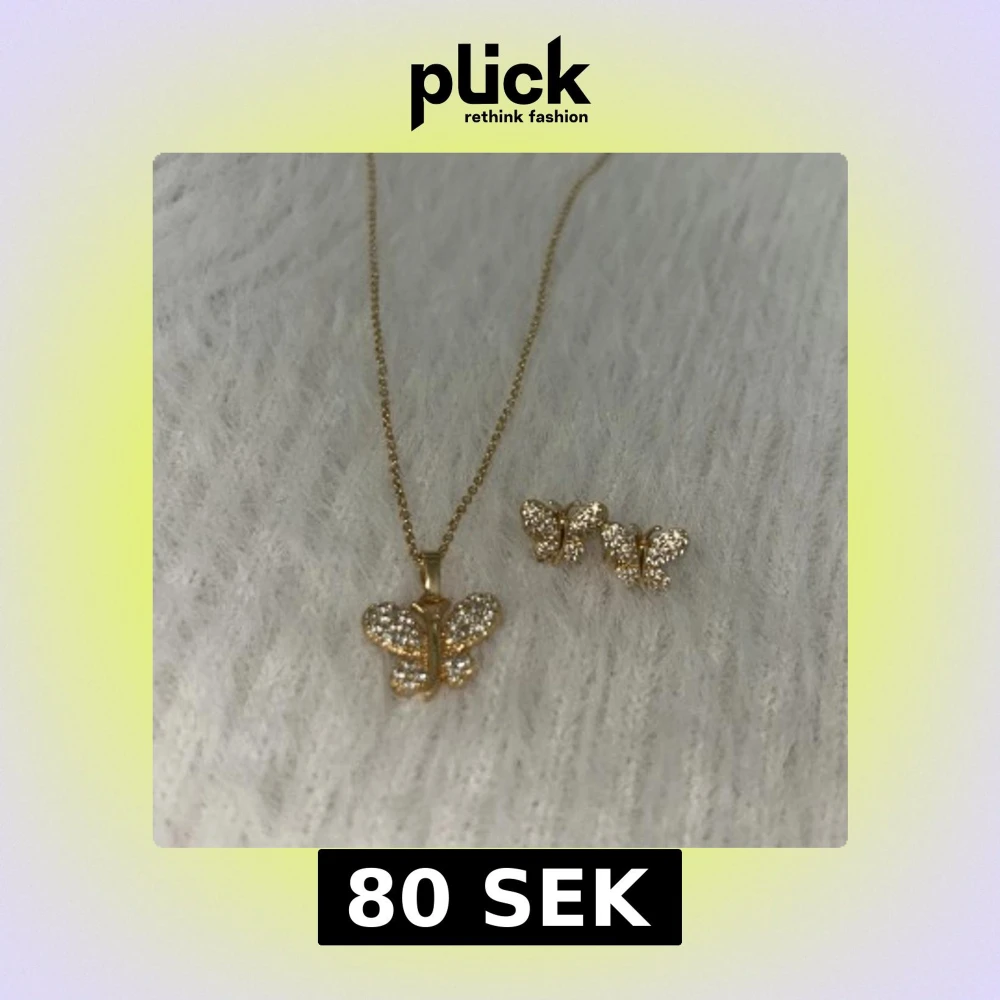 Superfint smyckeset med halsband och örhängen i form av fjärilar. Både halsbandet och örhängena är i guldton och dekorerade med glittrande stenar som ger en lyxig känsla. Perfekt för dig som älskar detaljer och vill sticka ut med något extra sött.