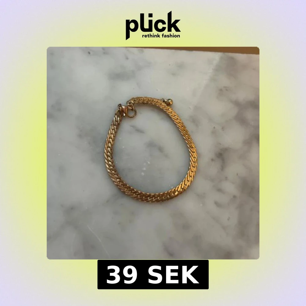 Armband i guldig färg med platt, tätt länkad kedja och enkel låsning.