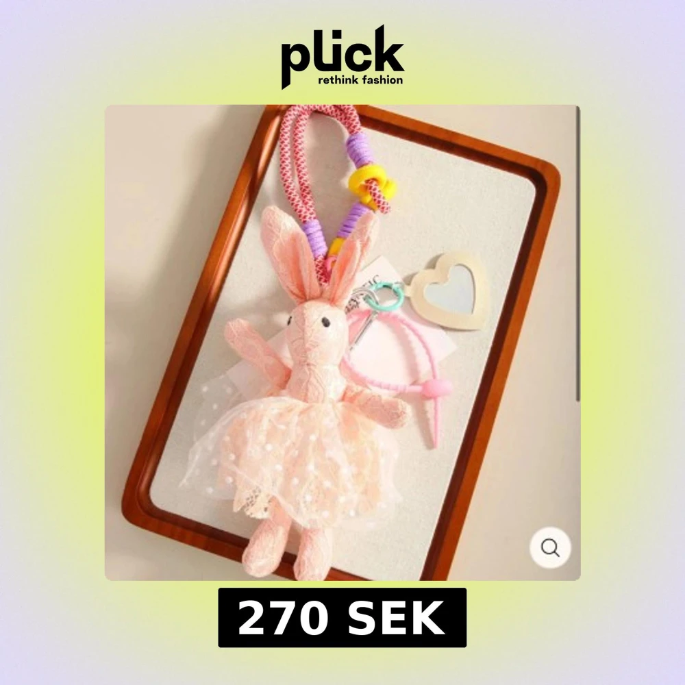 Supergullig liten väska/nyckelring med en rosa kanin i spetsklänning, hjärtformat spegelhänge och färgglada repdetaljer i lila, gult och rött. Perfekt att hänga på väskan eller använda som accessoar. Sötaste detaljen till din look! Nypris 300kr.