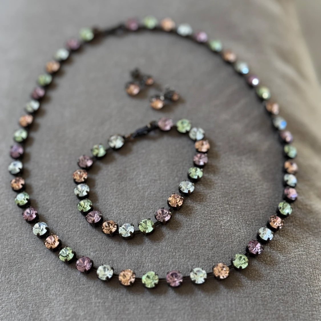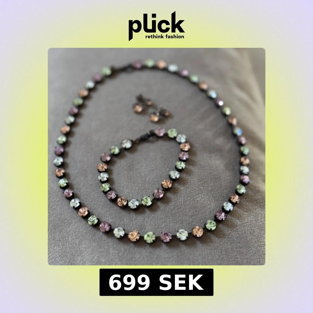 Snyggt smyckeset med halsband, armband och örhängen. Alla delar har runda, gnistrande stenar i pastellfärger som rosa, grön, lila och ljusblå. Stenarna sitter i mörka fattningar och ger en glittrig och färgglad look. Perfekt för dig som gillar att sticka ut.