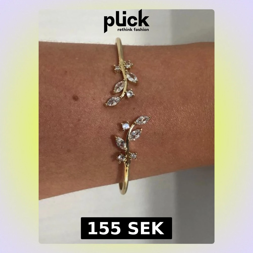 Snyggt guldigt armband med glittrande kristaller i form av blad och små stenar. Designen är elegant och har en tunn, böjd form som sitter fint runt handleden. Perfekt för dig som gillar detaljer och vill ha något som sticker ut.