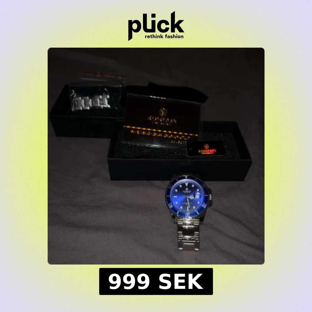 Snygg klocka från Kompass Stockholm med blå urtavla och silverfärgat armband i stål. Klockan har tydliga index, datumvisning och vridbar bezel. Kommer med extra länkar, originalask och garanti. Perfekt accessoar för dig som gillar stilren design.