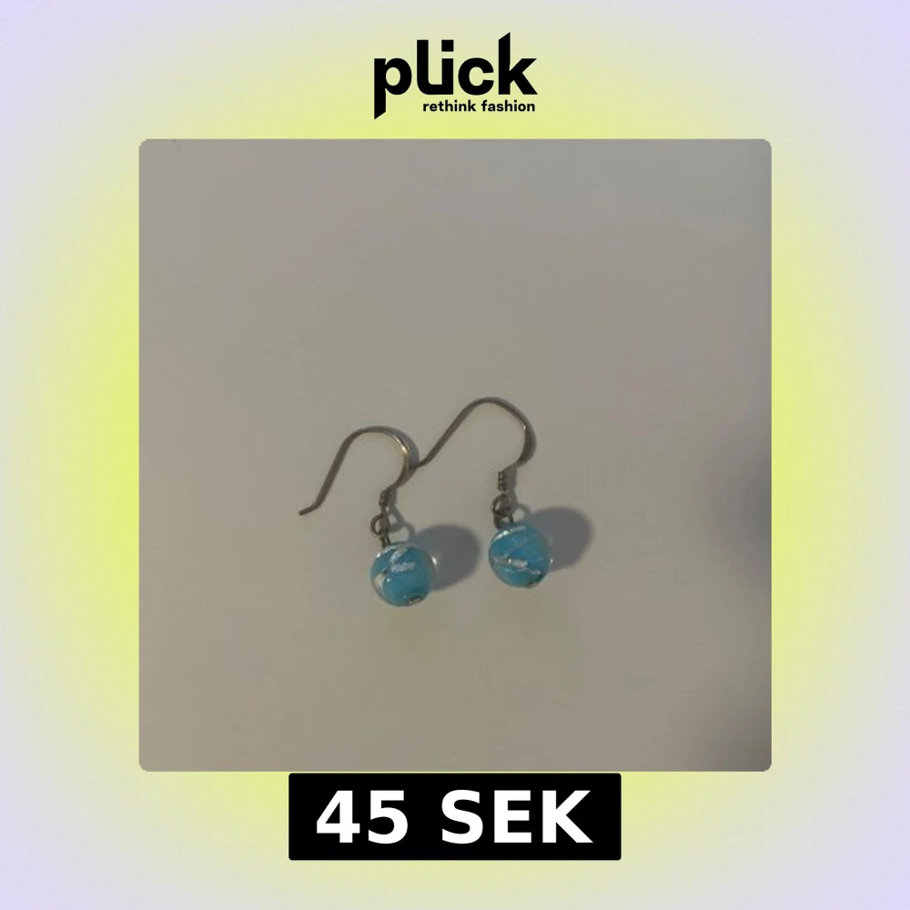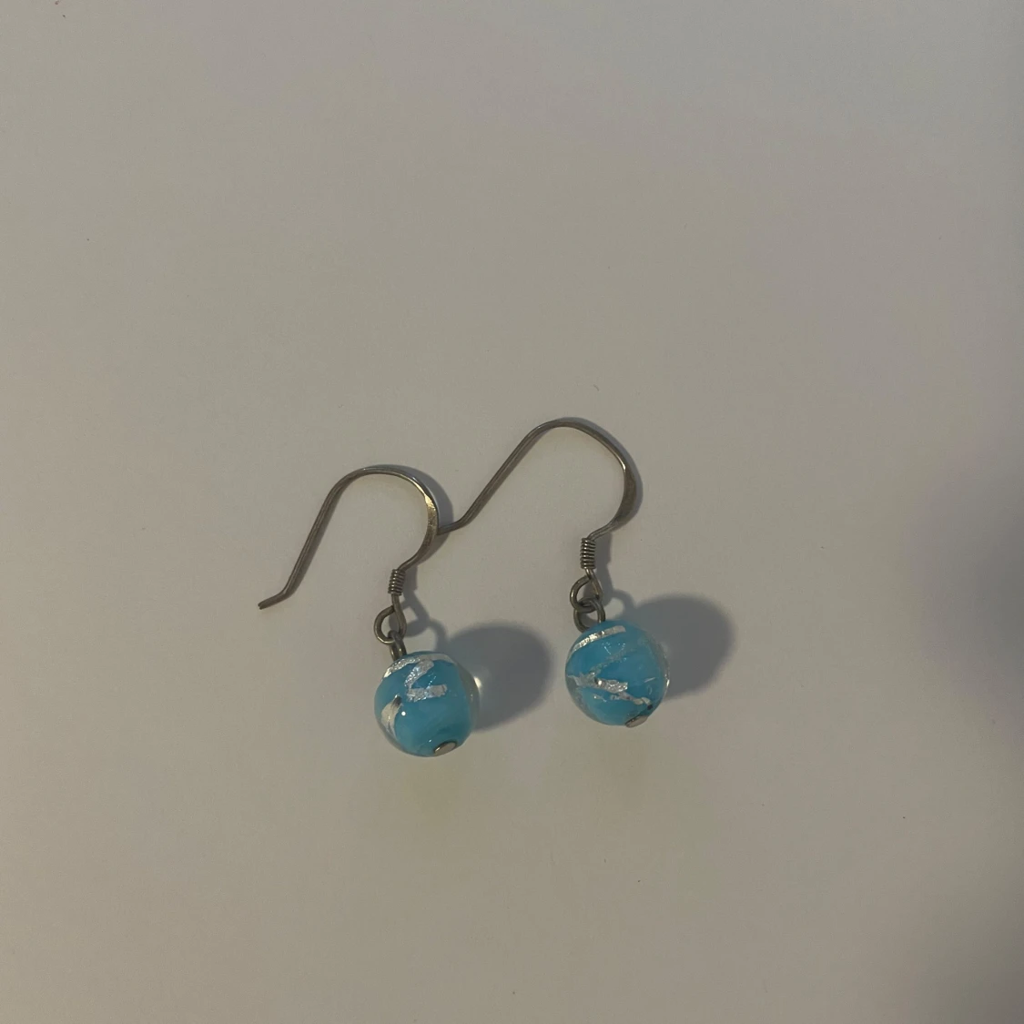 Säljer ett par snygga örhängen med blå runda pärlor och silvriga inslag. Krokarna är i metall och pärlorna har ett unikt mönster med vita och silverfärgade slingor. Perfekt för dig som vill ha något färgglatt och personligt i öronen.