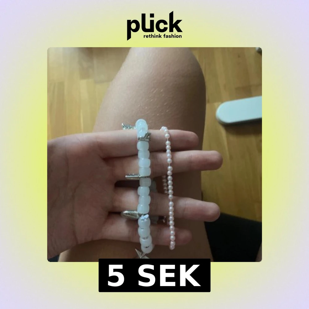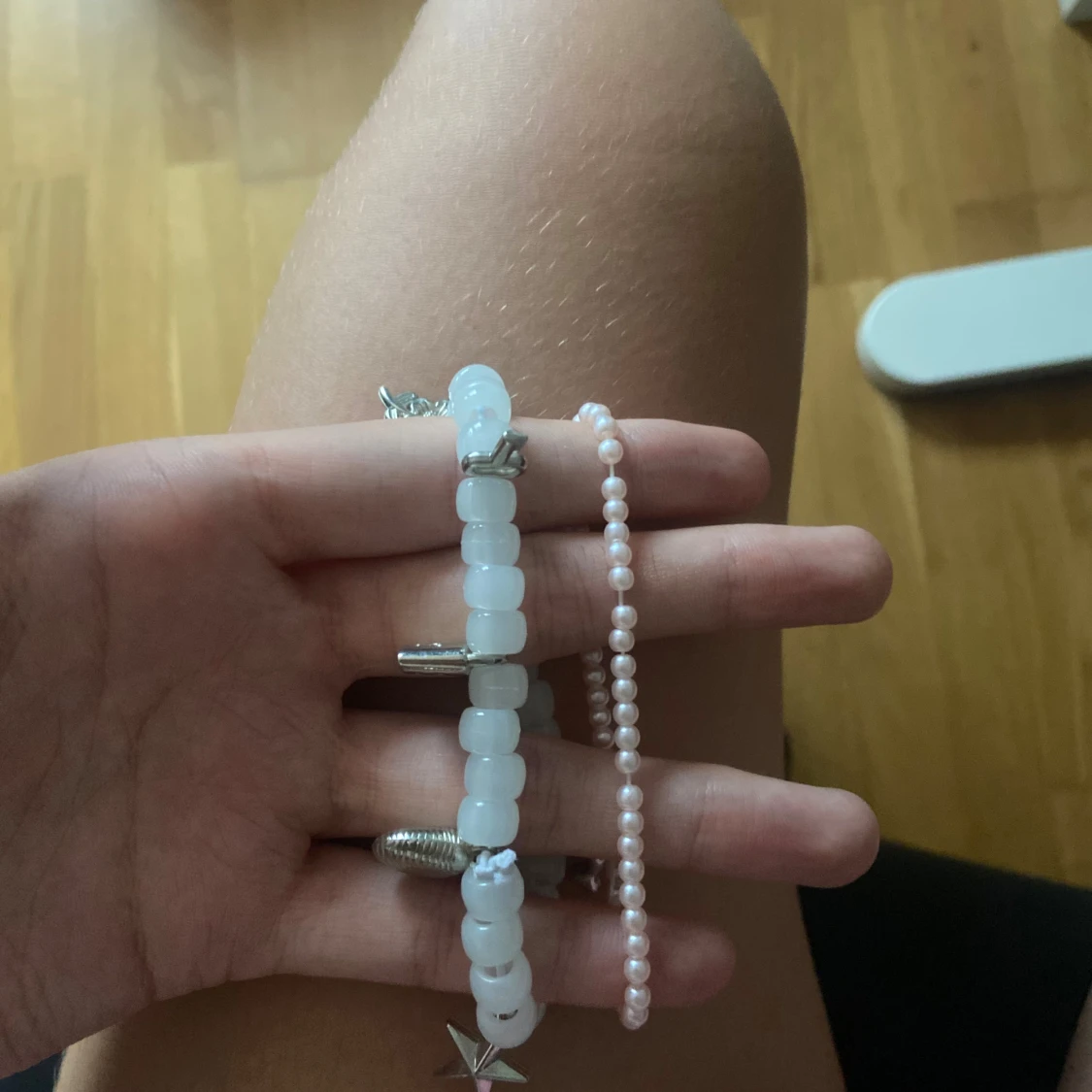 Säljer två snygga armband, ett med större vita pärlor och coola silvriga detaljer som stjärna och spikes, och ett med små ljusrosa pärlor. Perfekta accessoarer för att lyfta din outfit!