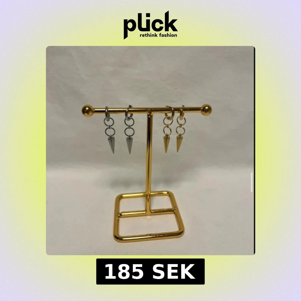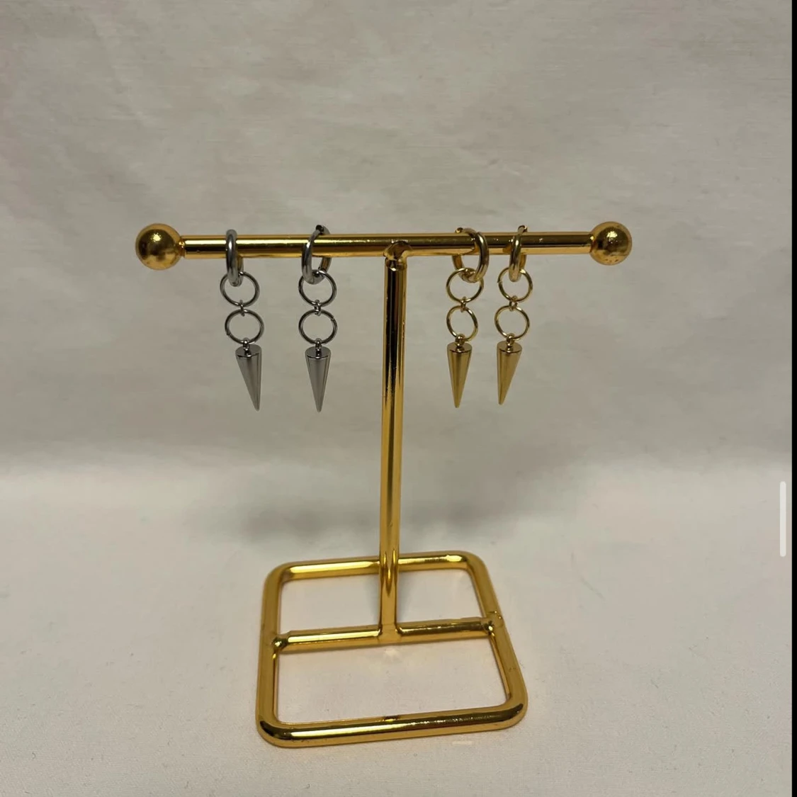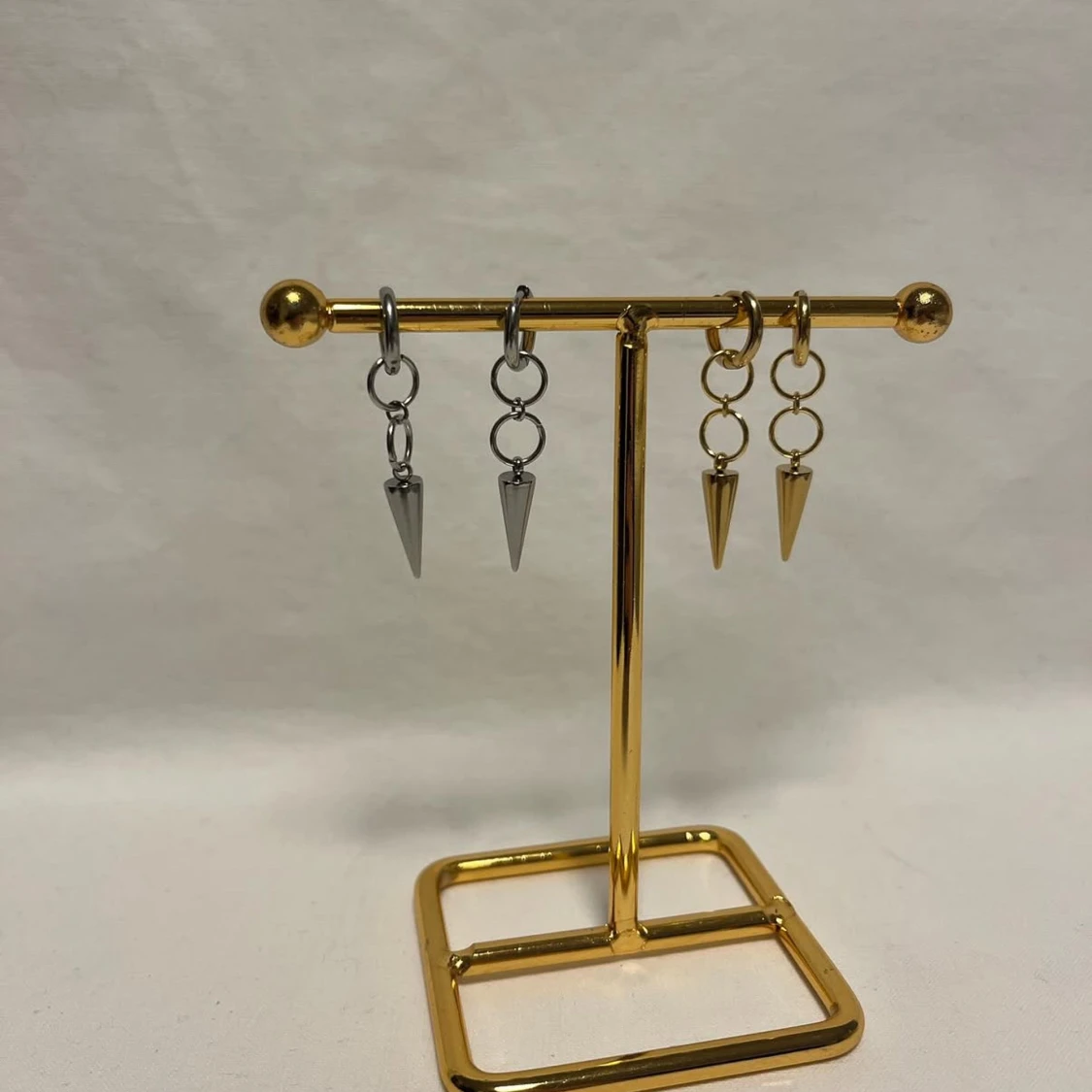 Två par örhängen med coola konformade hängen, ett par i silverfärg och ett par i guldfärg. Båda har dubbla ringar som ger en edgy vibe och passar perfekt för dig som gillar att sticka ut. Snygga att mixa och matcha för en personlig stil.