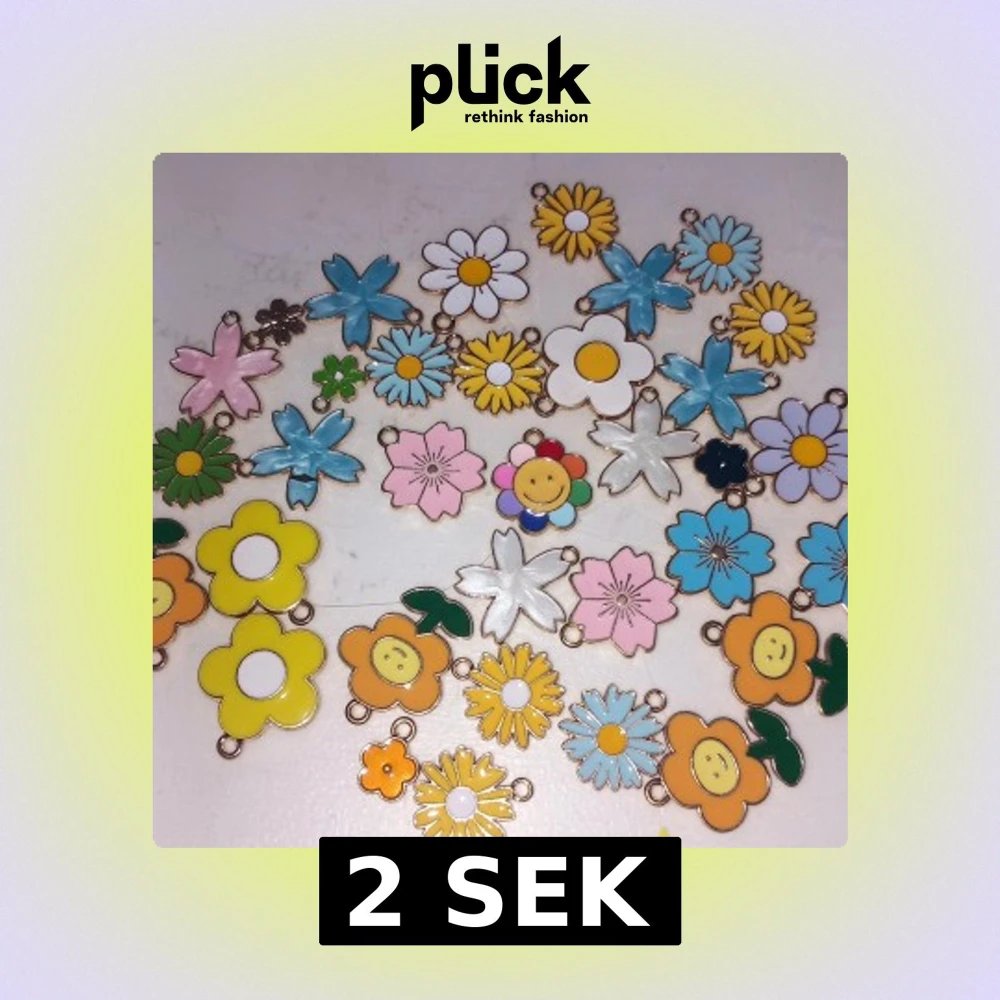 Säljer ett gäng söta blomberlocker i olika färger som passar perfekt till att göra egna halsband, armband eller örhängen. Mix av blommor i gult, blått, rosa, grönt, vitt och orange, vissa med smiley-ansikten. Metallkant och emaljfinish ger en poppig och lekfull vibe.