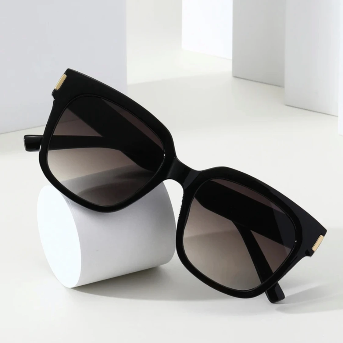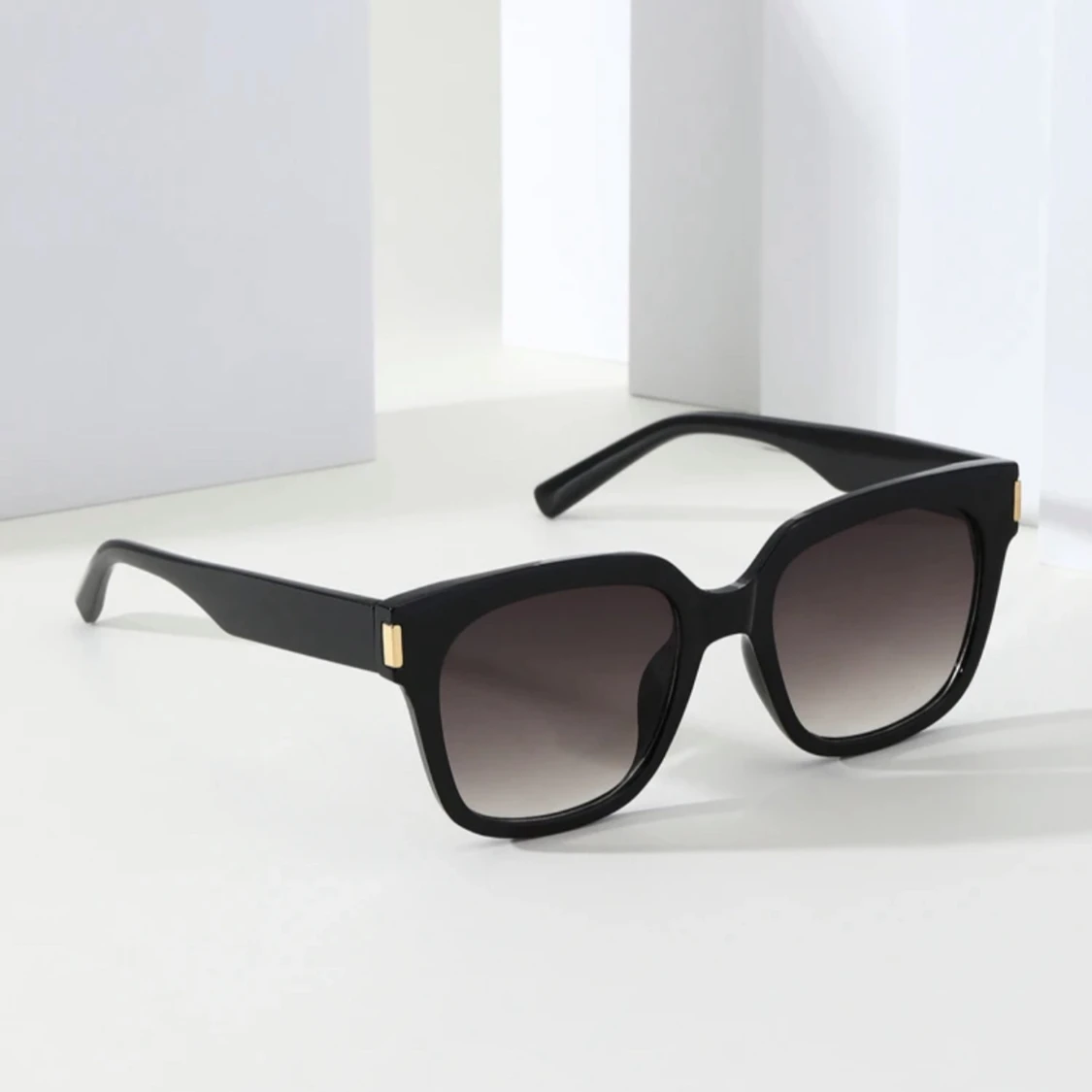 Stilrena svarta solglasögon med oversized fyrkantig form och mörka tonade glas. Bågarna har diskreta gulddetaljer vid sidorna som ger en lyxig känsla. Perfekta för att lyfta din look med en trendig touch. PRISET GÅR ATT DISKUTERA!!!