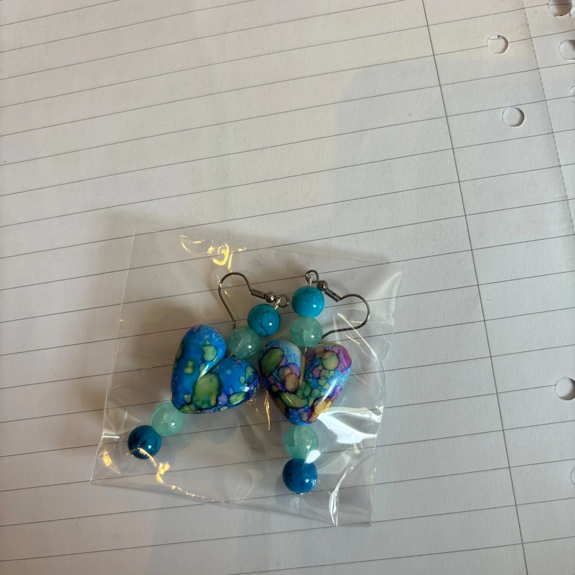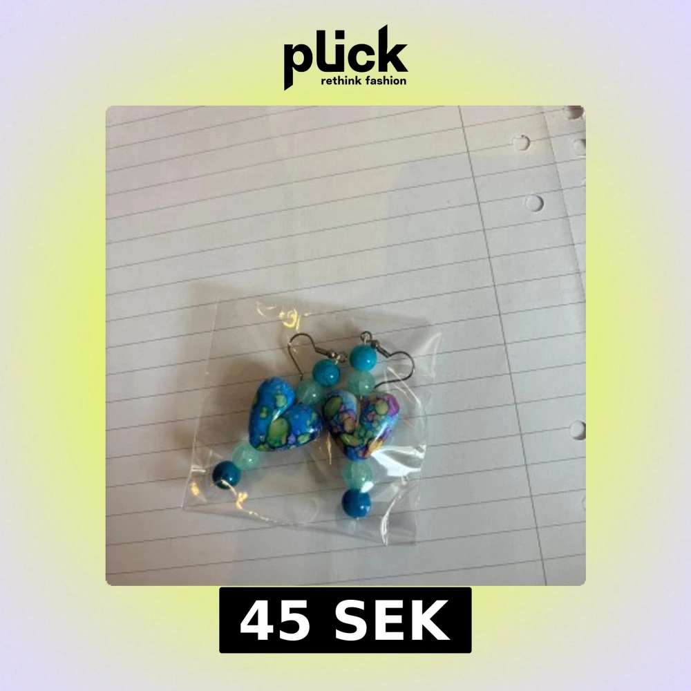 Säljer ett par unika örhängen med stora hjärtan i blått och turkost mönster. Örhängena har även små runda pärlor i olika blå nyanser. Perfekta för att ge din stil en färgklick!