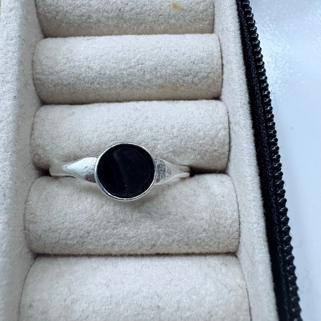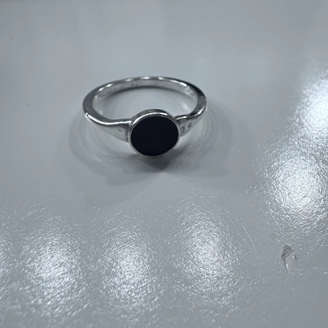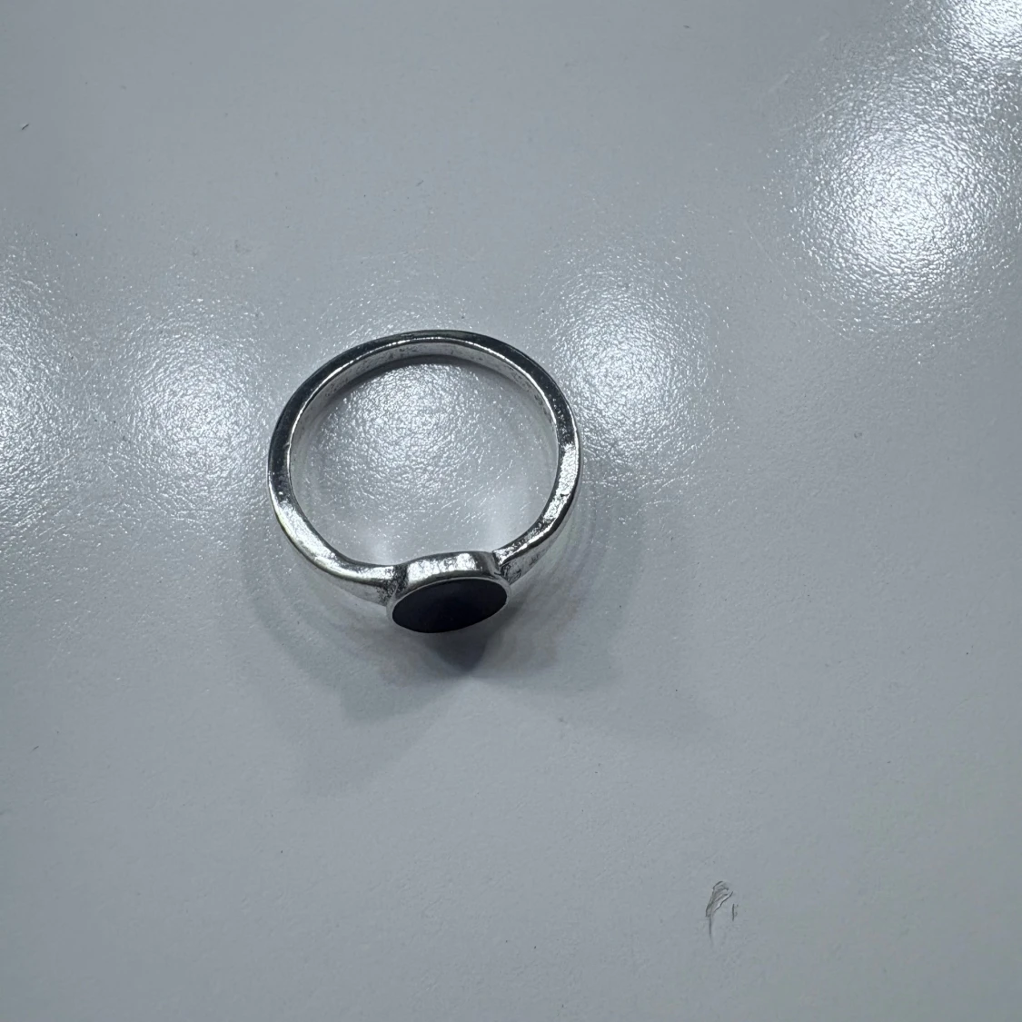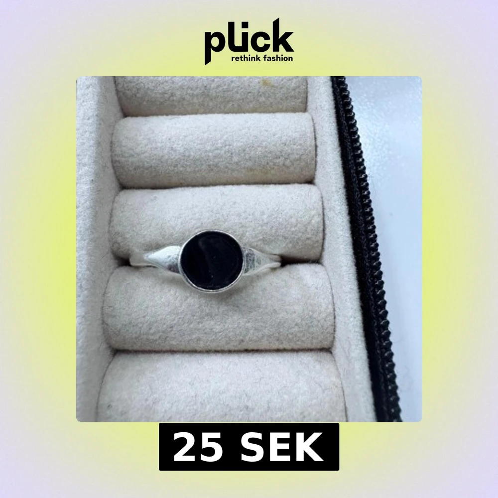 Säljer en stilren silverring med rund, svart sten i mitten. Ringen har en enkel och modern design som passar perfekt för dig som gillar minimalistiska smycken.