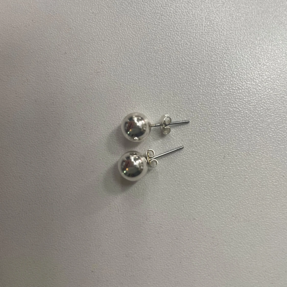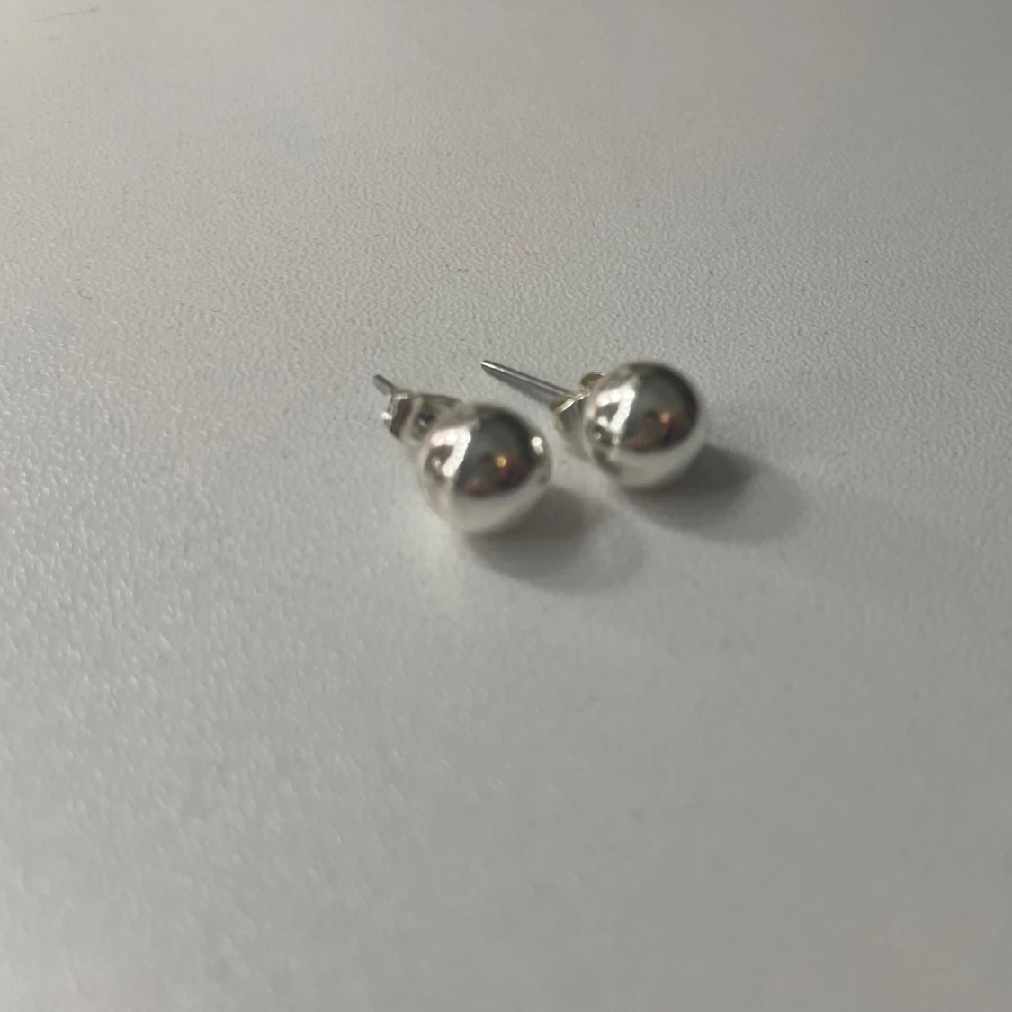 Säljer ett par stilrena örhängen i form av blanka, runda bollar i silverfärg. De har klassisk stiftmodell och passar perfekt om du gillar minimalistiska smycken med en modern touch. Enkla att matcha med allt och ger en clean look.