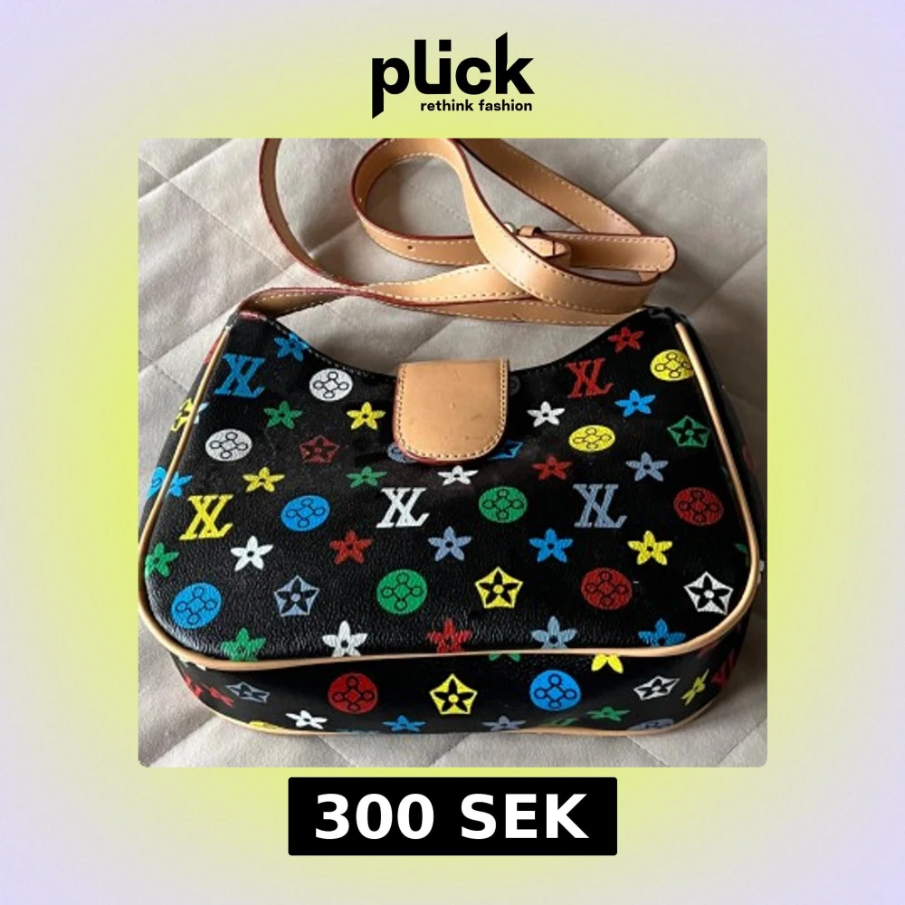Snygg axelväska med färgglatt monogrammönster på svart bakgrund. Väskan har en justerbar axelrem i ljusbrunt skinn och en praktisk stängning med tryckknapp. Perfekt för att ge en färgklick till din outfit!