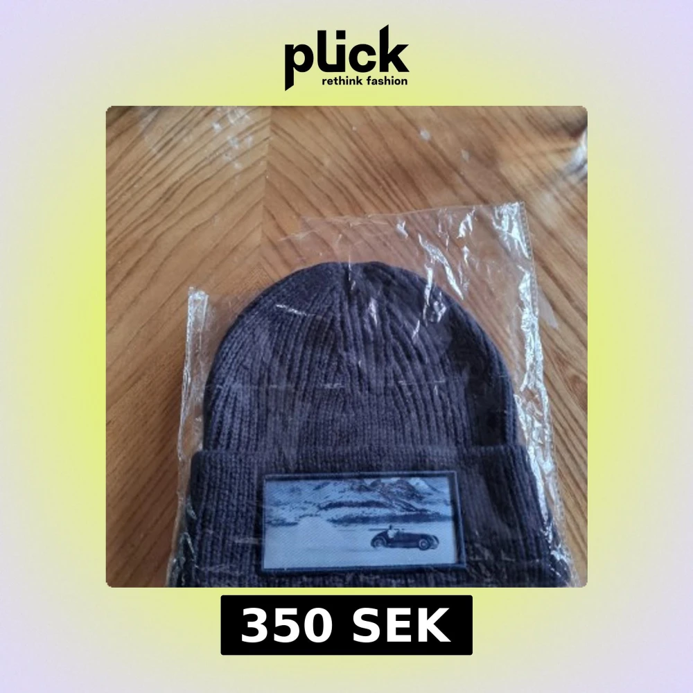 Snygg svart stickad mössa från Revenite AB med en cool broderad patch av en bil och berg. Perfekt för att hålla värmen med stil. Ny och aldrig använd. Endast upptagen ur plasten för fotografering.