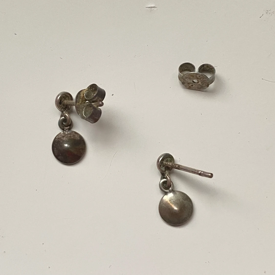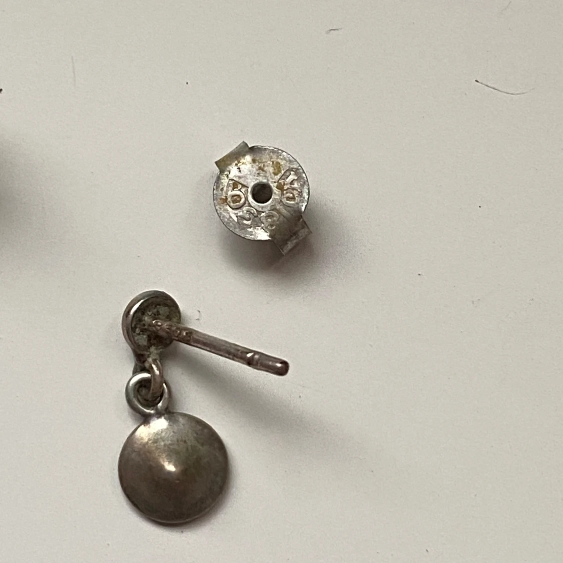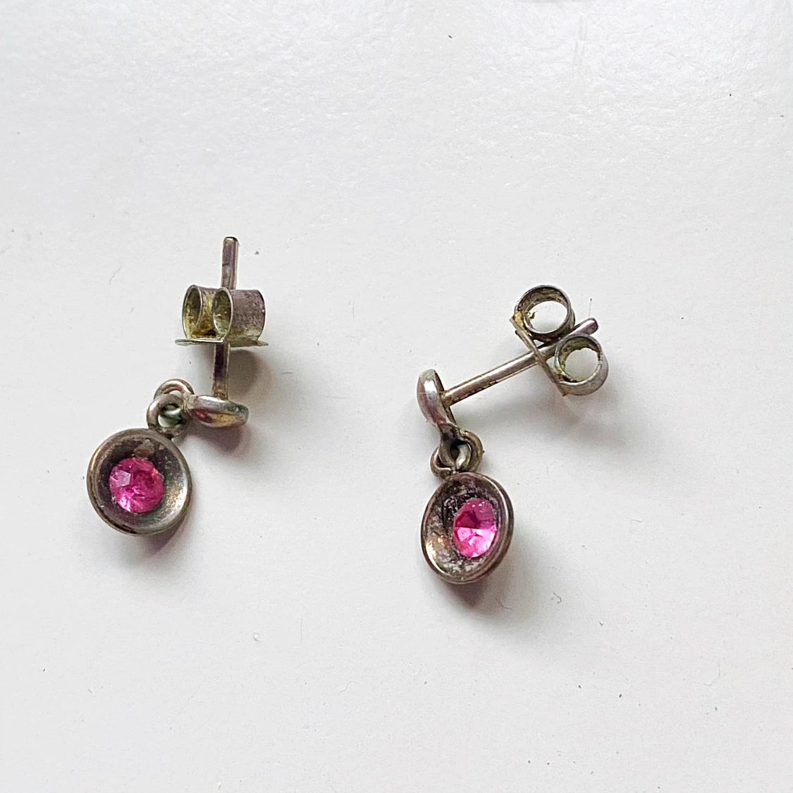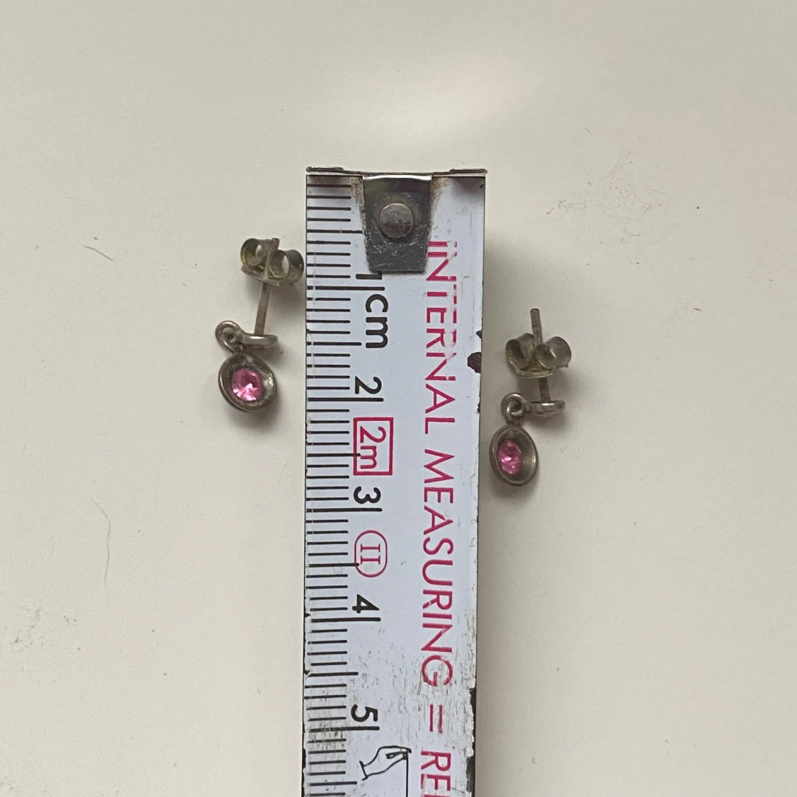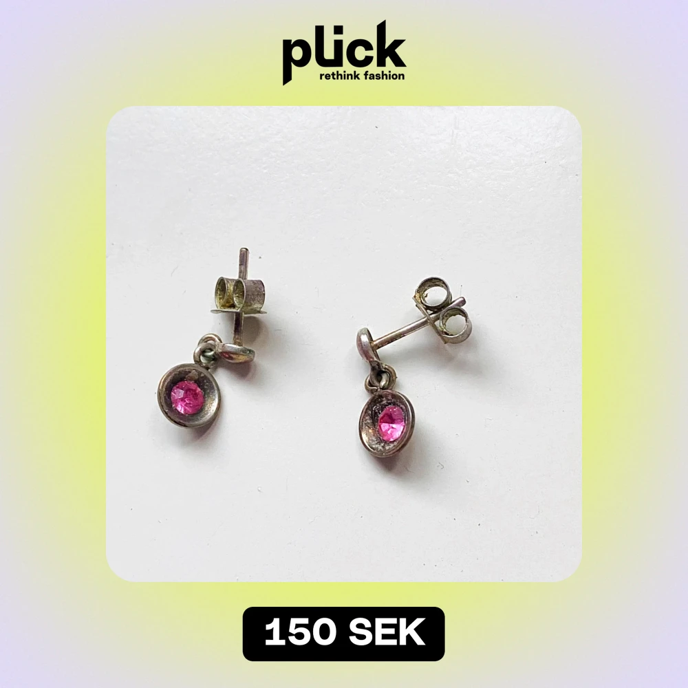 Säljer ett par söta örhängen i silver med hängande rosa stenar. Perfekta för att ge en färgklick till din outfit! De är i bra skick och har en enkel men elegant design. Passar både till vardags och festliga tillfällen. Stämplat 830 i bakstycke
