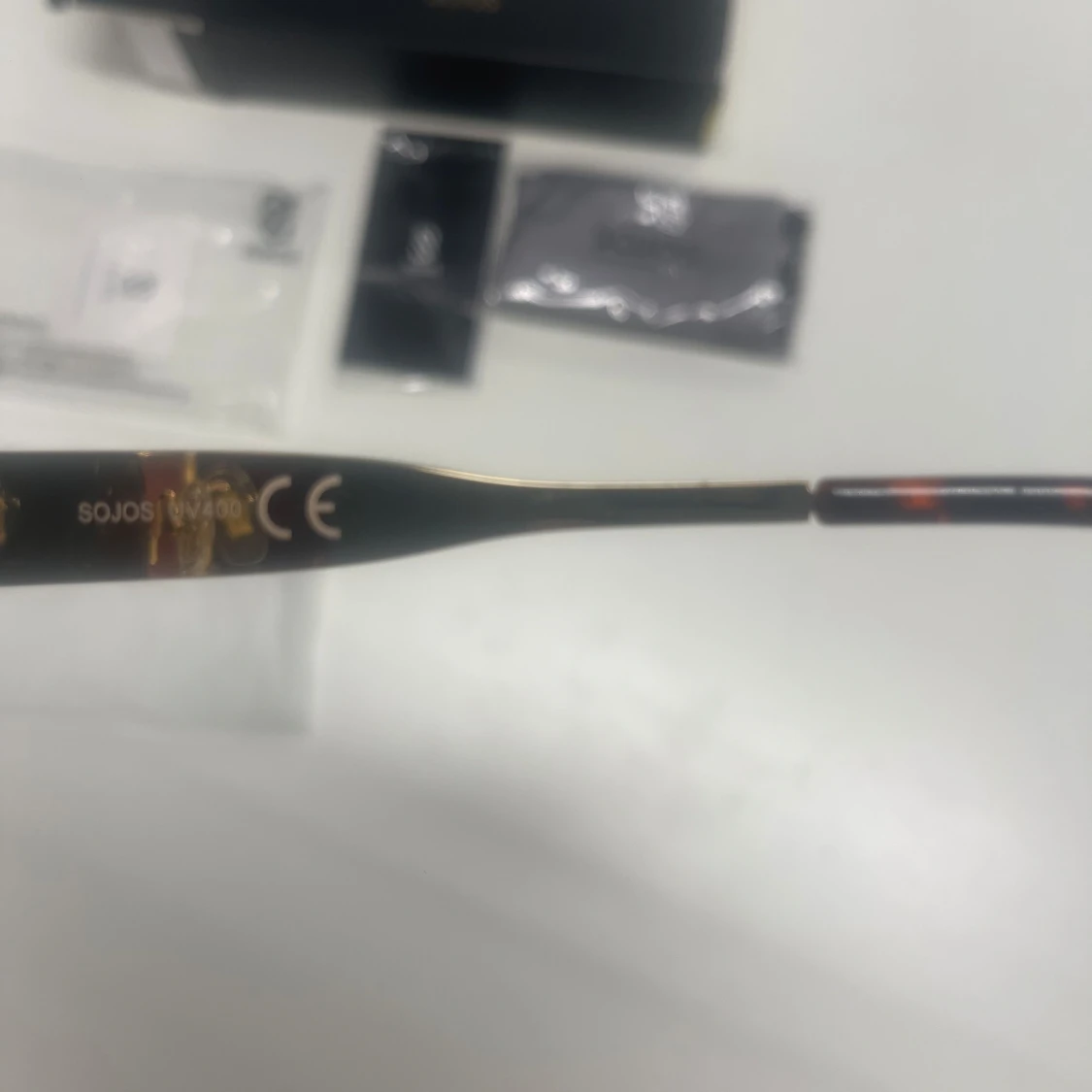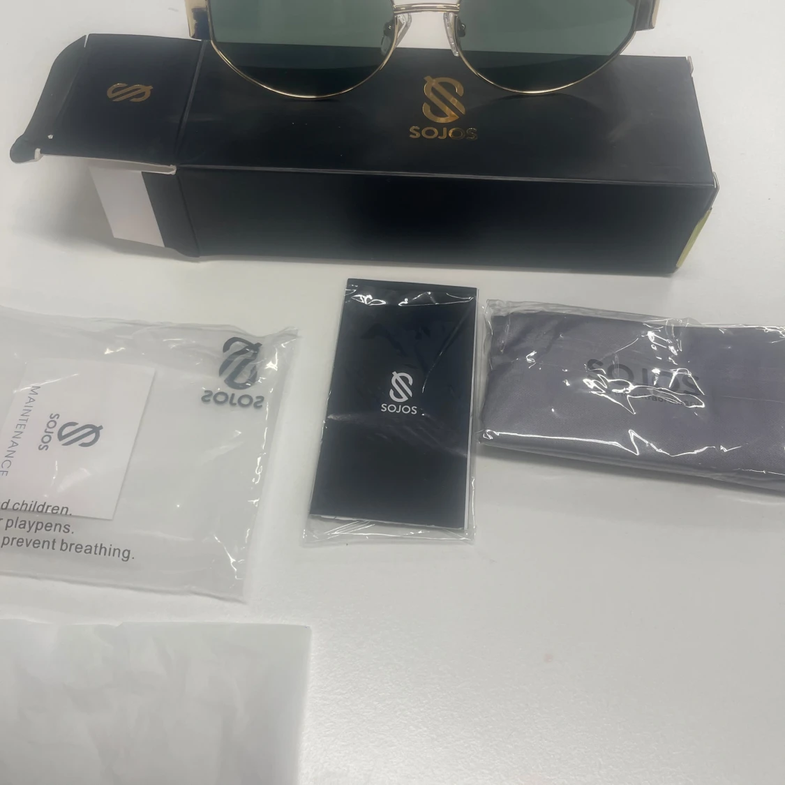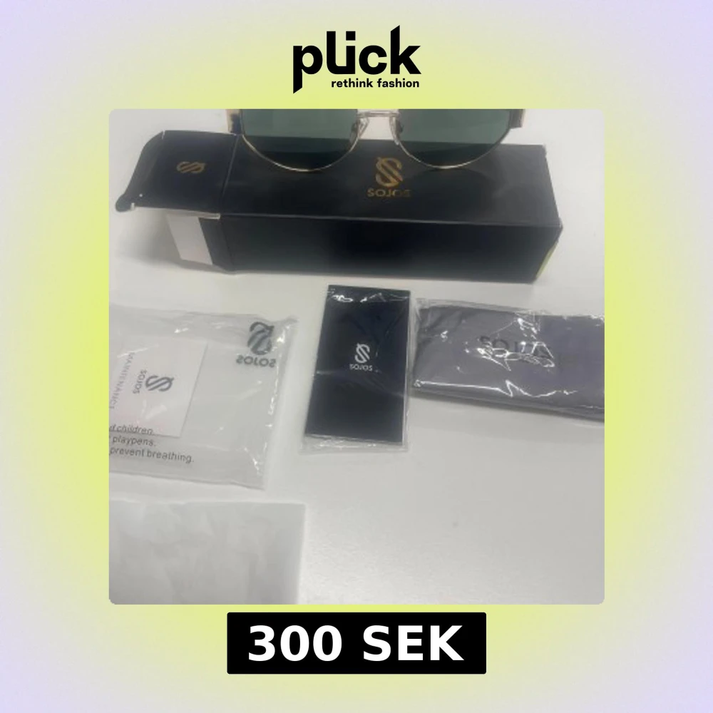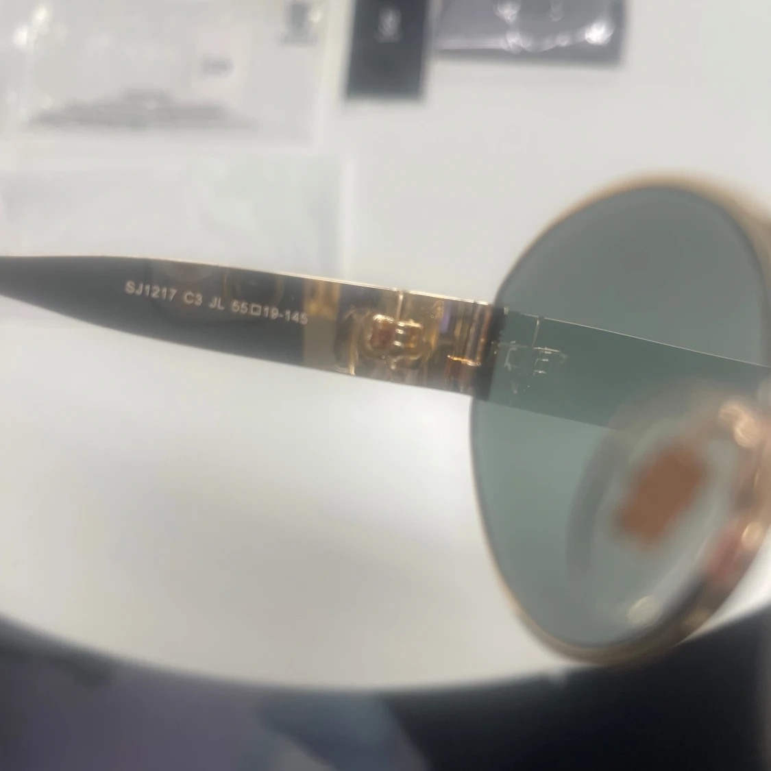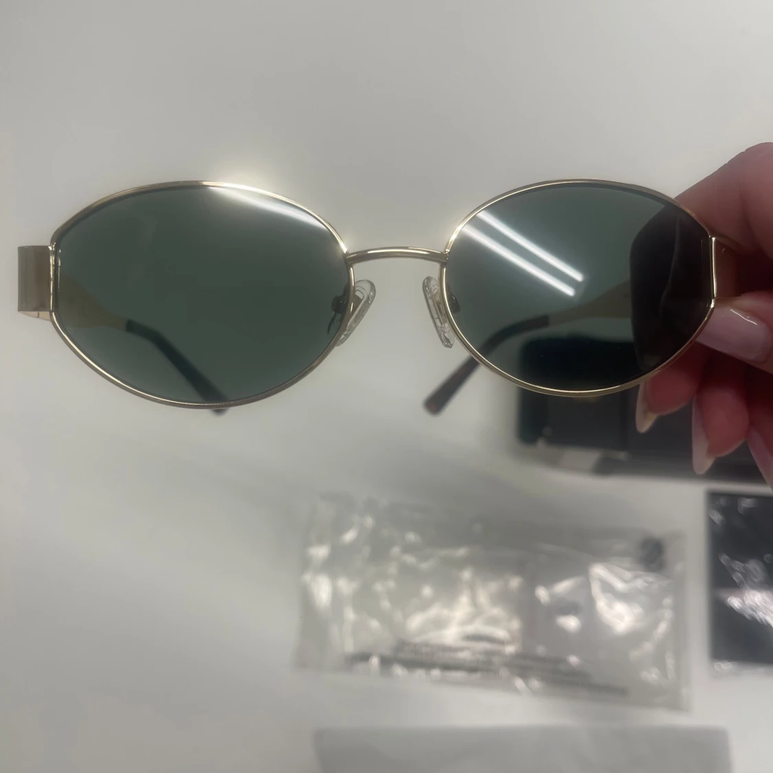 Snygga solglasögon med ovala gröna linser och guldig metallbåge. Sidorna är breda, populär modell som tyvärr inte passar mig. Kommer med originalförpackning och putsduk.