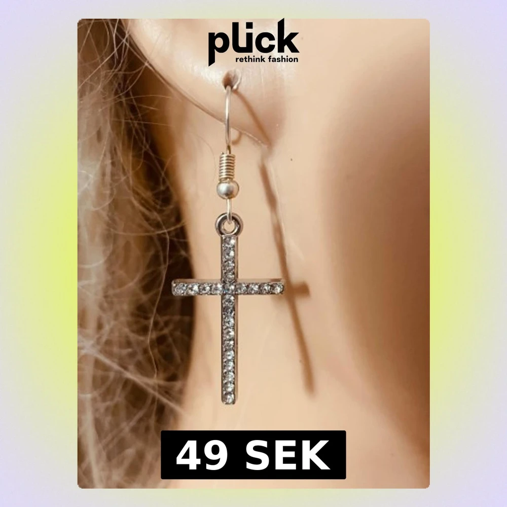 Häftigt örhänge med korsformat hänge dekorerat med glittrande stenar.
