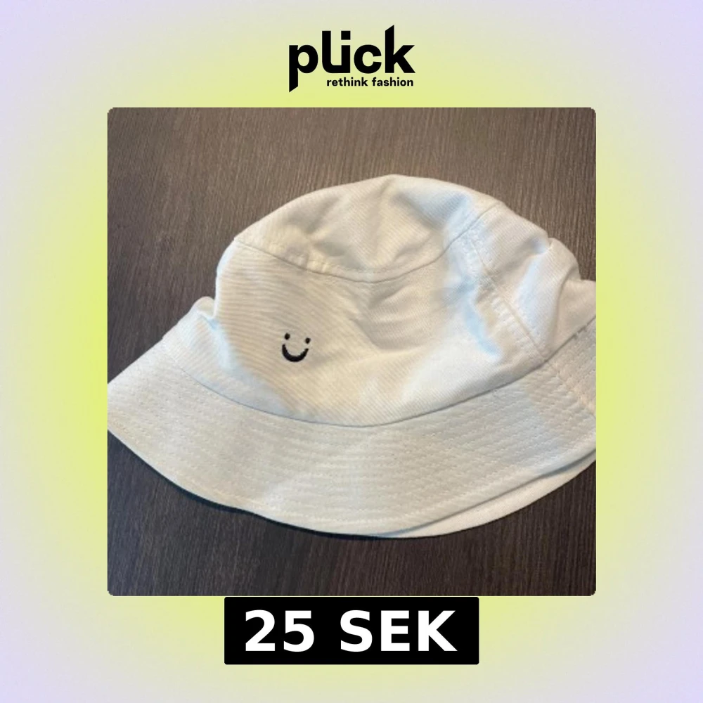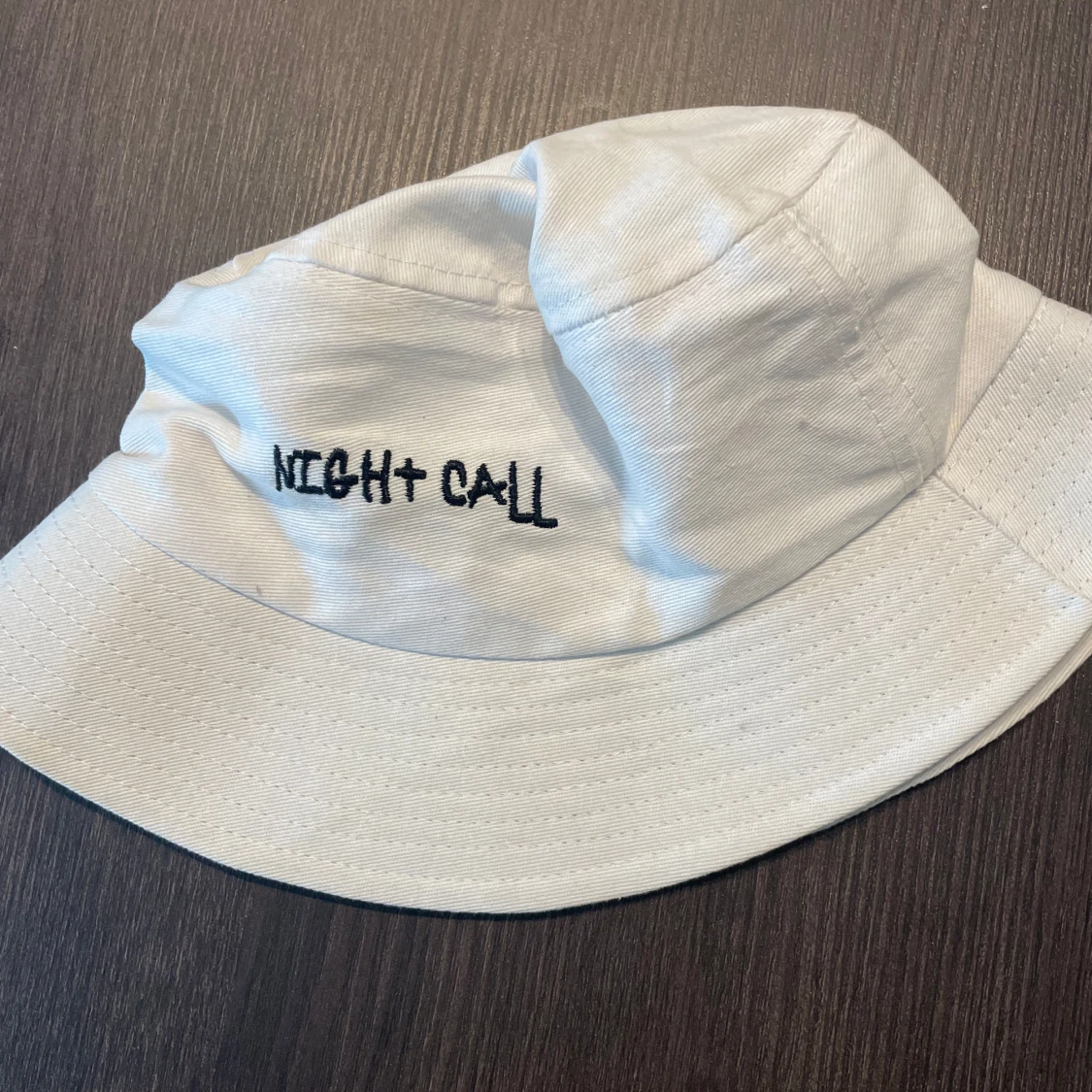 Bucket hat i vit bomull med broderad smiley på ena sidan och texten 'NIGHT CALL' på andra sidan. Klassisk form med bred brätte och stilren look, perfekt för att lyfta din outfit med en chill vibe.