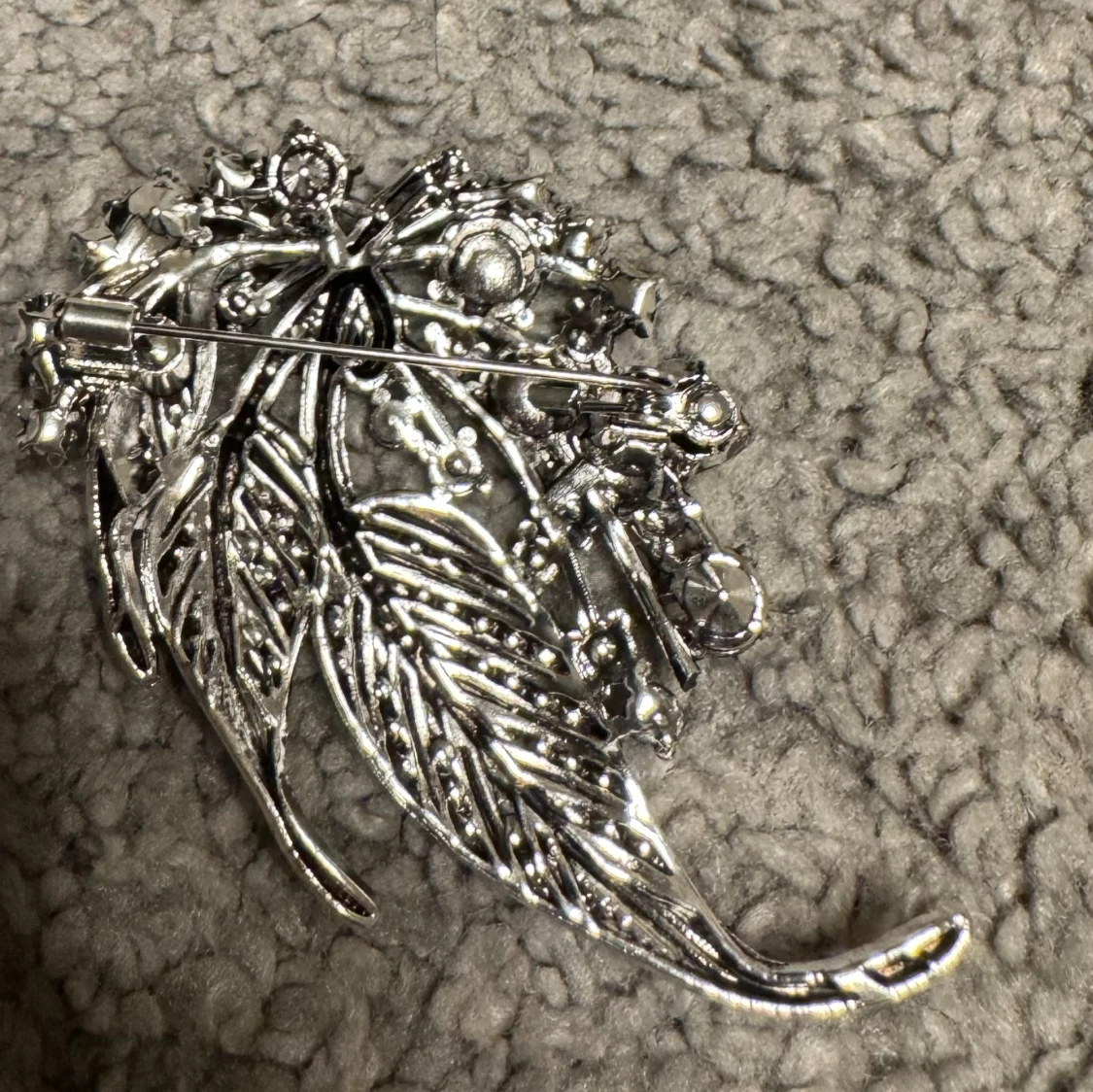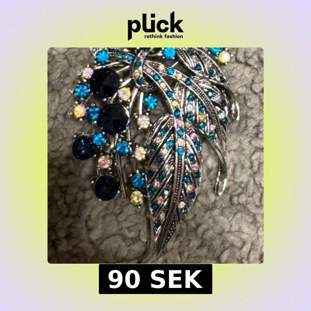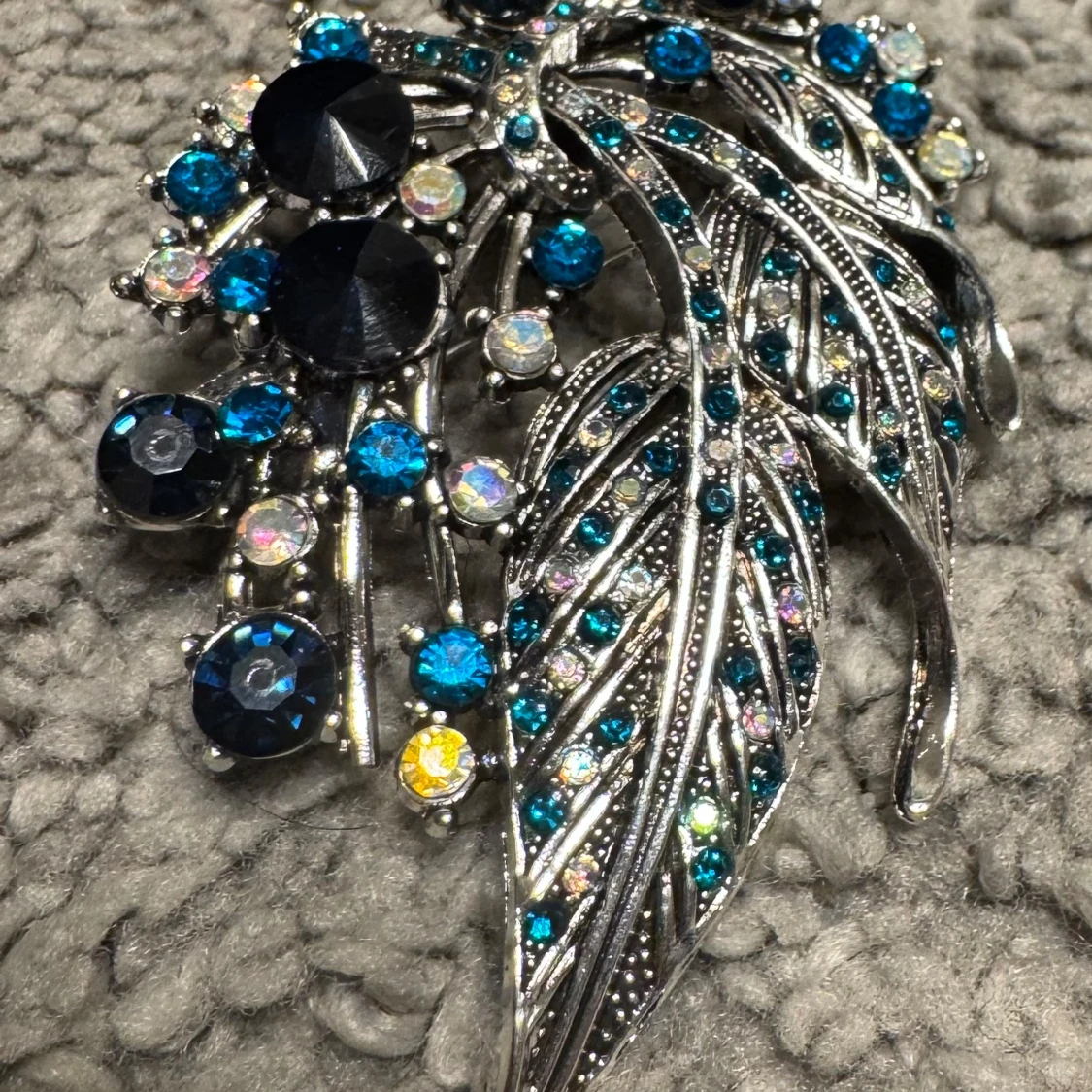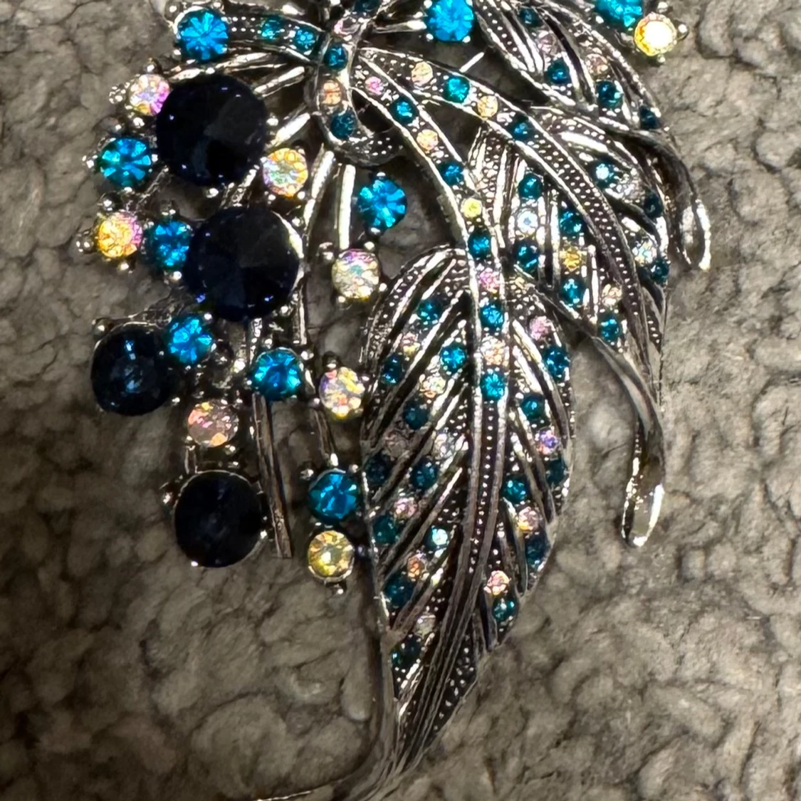 En fantastisk glittrig brosch i form av ett löv, dekorerad med gnistrande stenar i blått, rosa och lila. Perfekt för att ge en extra touch av glamour till din outfit.