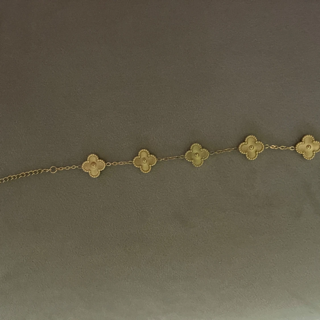 Elegant guldarmband med flera fyrklöverformade hängen. Perfekt för att lägga till en touch av lyx till din outfit. Hängena är jämnt fördelade längs kedjan och ger en stilren look.