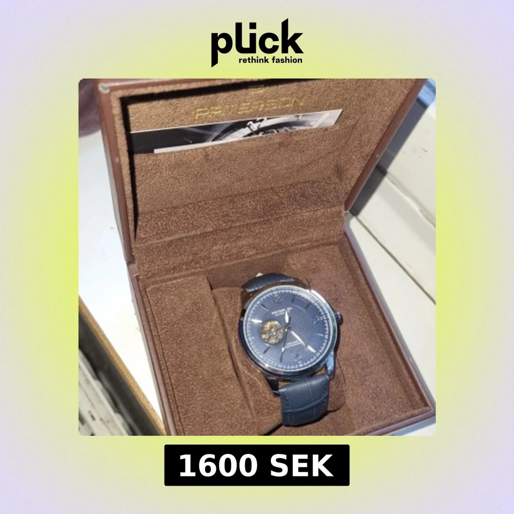 Snygg automatisk klocka från Paterson med blå urtavla och matchande blått läderarmband. Urtavlan har ett öppet hjärta som visar mekanismen och silverfärgade detaljer. Boetten är i rostfritt stål och baksidan har glas som visar urverket. Kommer i exklusiv brun box.