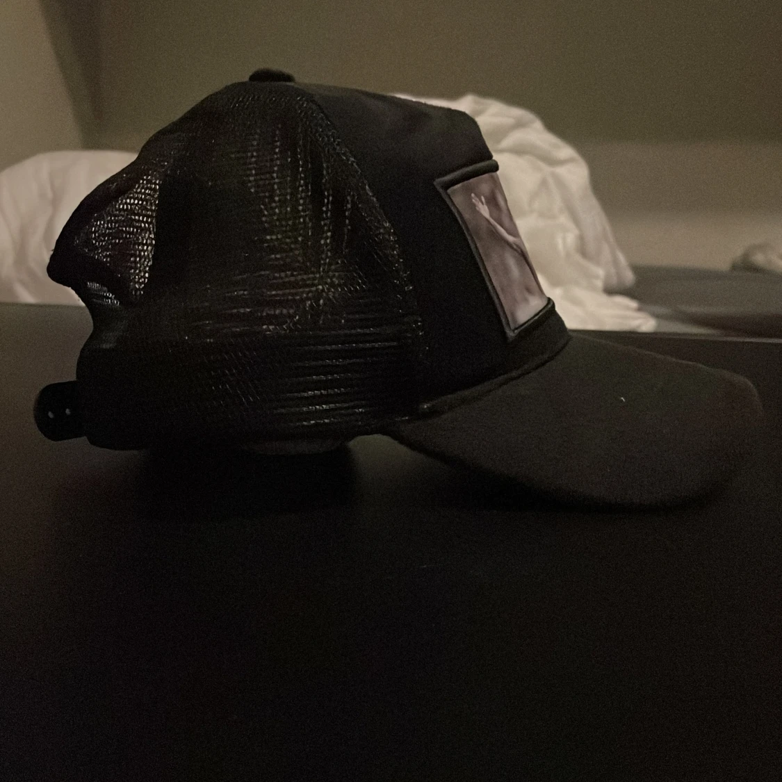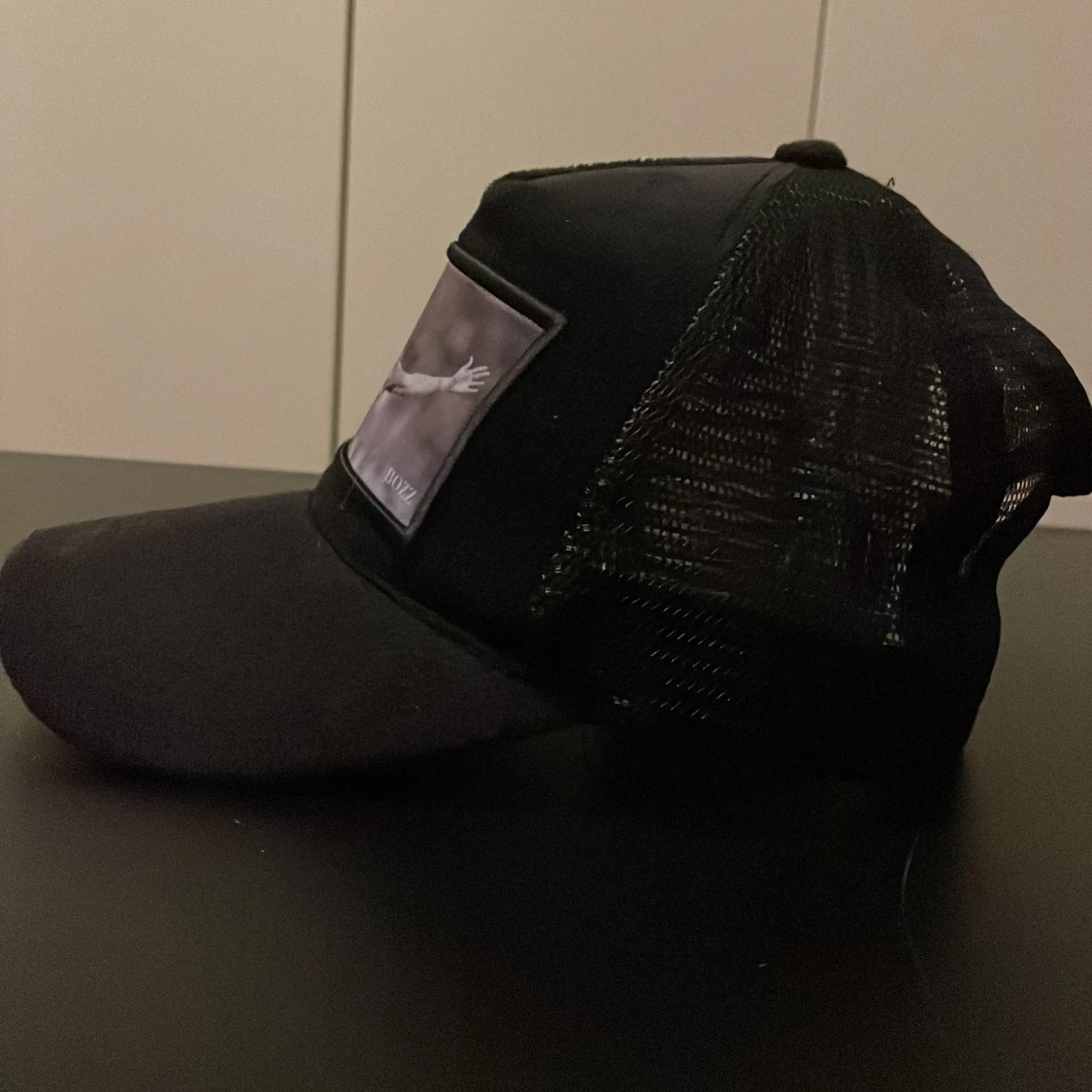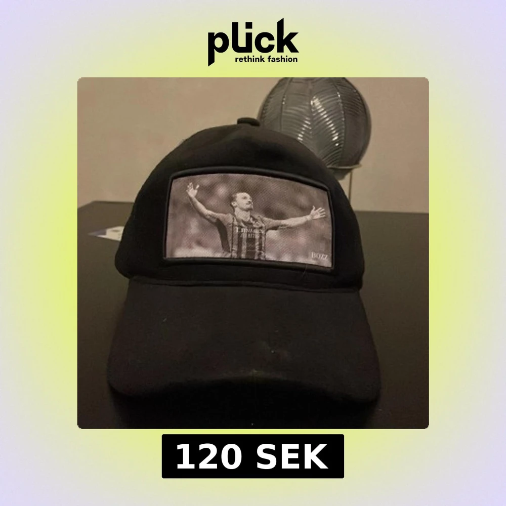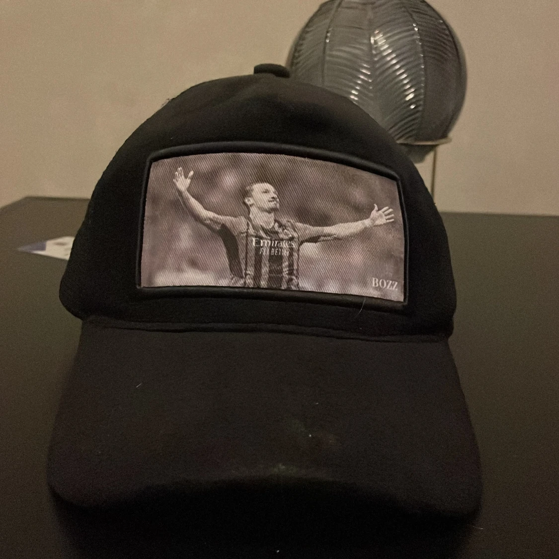 Svart keps med böjd skärm och mesh på sidorna. Framtill finns ett svartvitt tryck av en fotbollsspelare med utsträckta armar. Märket BOZZ syns på framsidan. Perfekt för dig som gillar sportig stil.