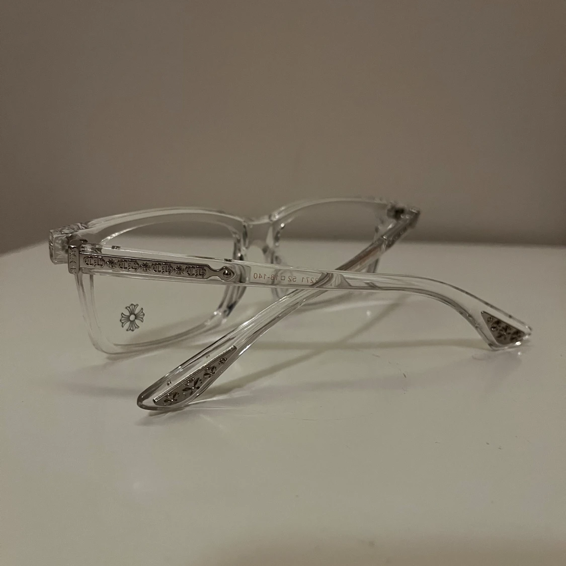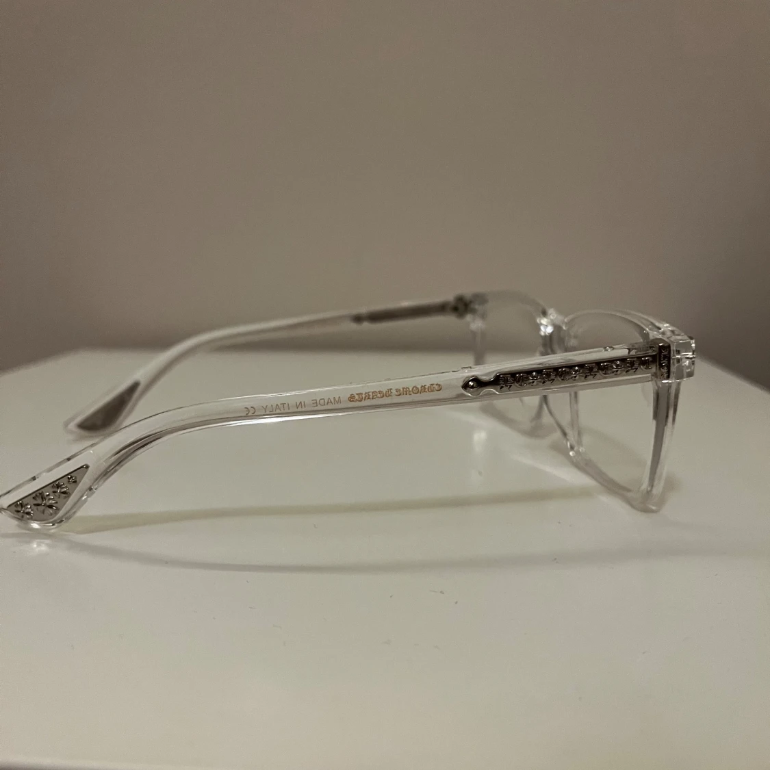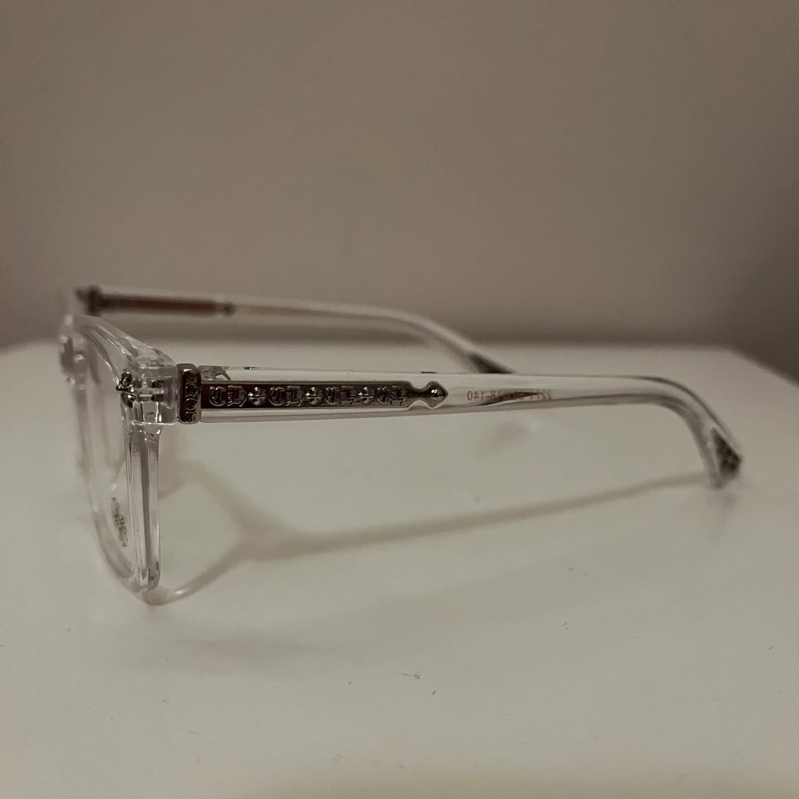 Säljer ett par stilrena glasögon från Chrome Hearts med transparent båge och rektangulär form. Sidorna har snygga silverdetaljer och små dekorationer som ger en lyxig känsla. Perfekta för dig som vill sticka ut med en unik accessoar. Har gold också