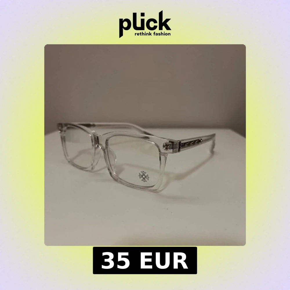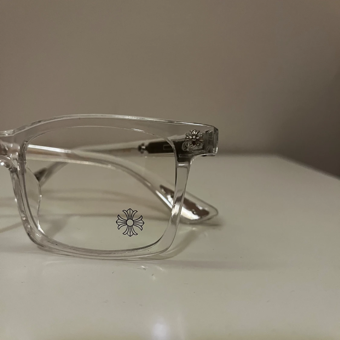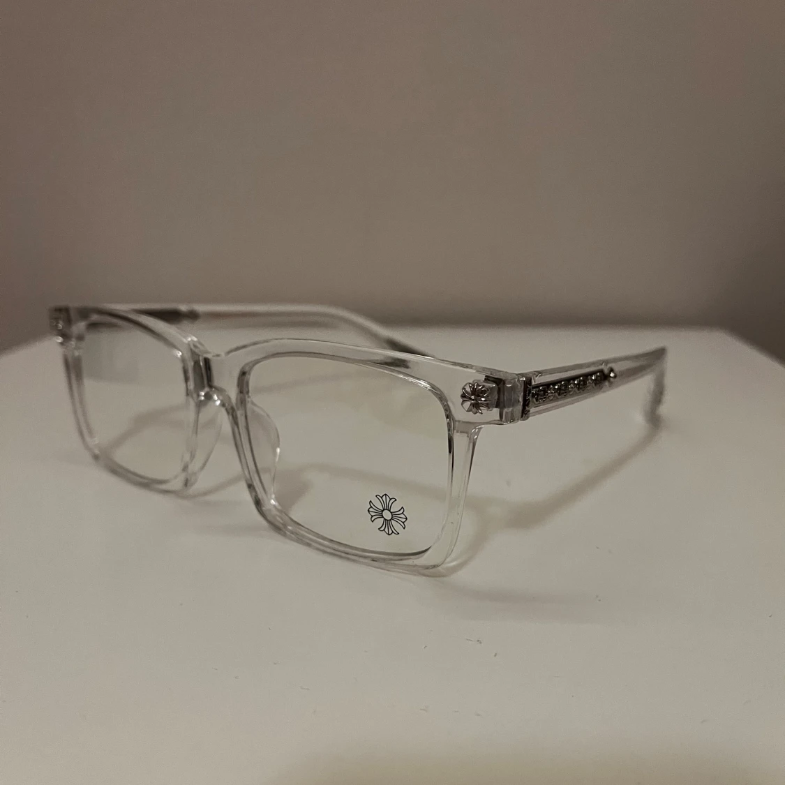 Säljer ett par stilrena glasögon från Chrome Hearts med transparent båge och rektangulär form. Sidorna har snygga silverdetaljer och små dekorationer som ger en lyxig känsla. Perfekta för dig som vill sticka ut med en unik accessoar. Har gold också