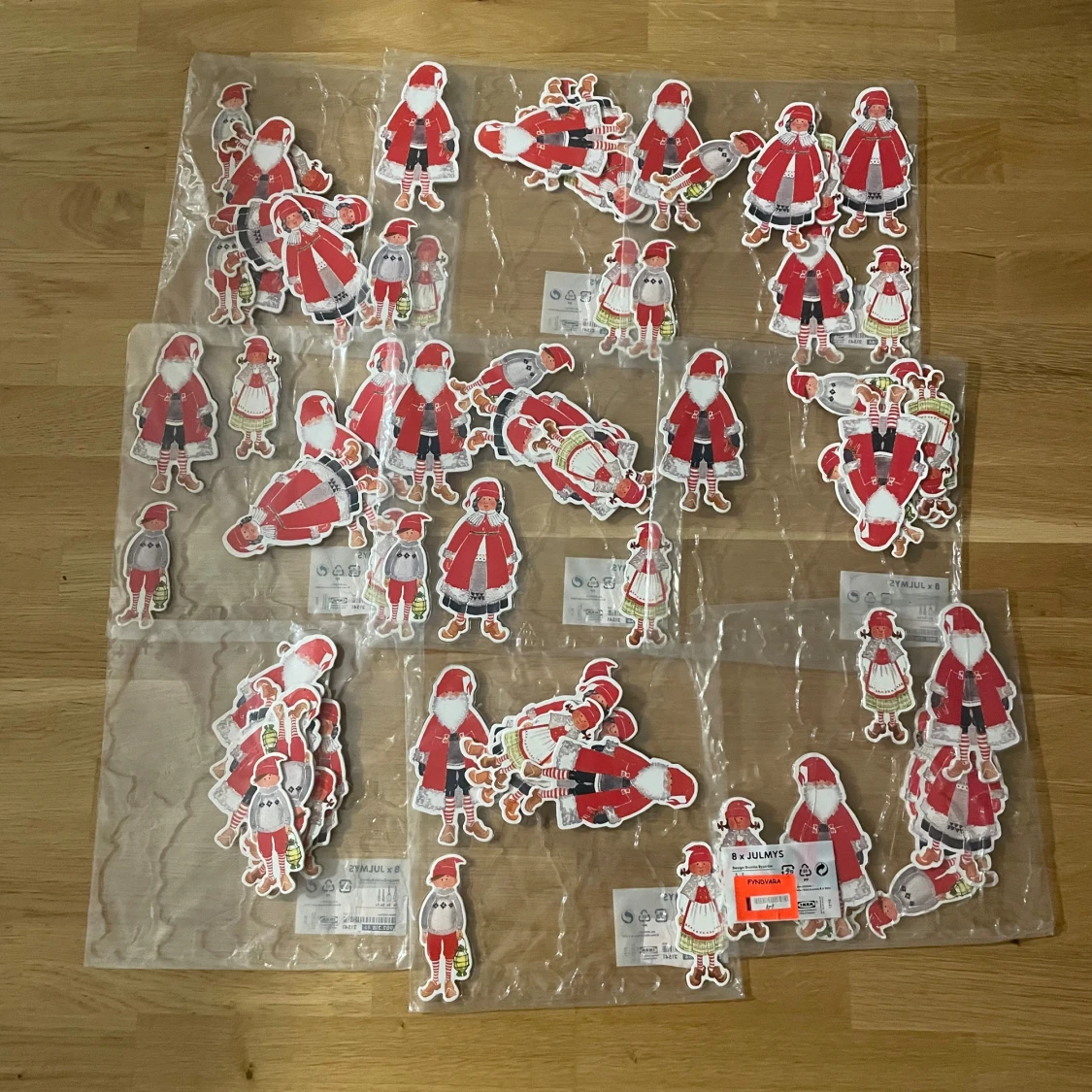Säljer ett gäng pappersfigurer med klassiska röda tomteluvor, perfekta för julpynt eller DIY-projekt. Figurerna har olika motiv med tomtar och nissar, alla med röd luva och detaljer i vitt och grått. Passar dig som vill ha en mysig julkänsla hemma. 20kr styck